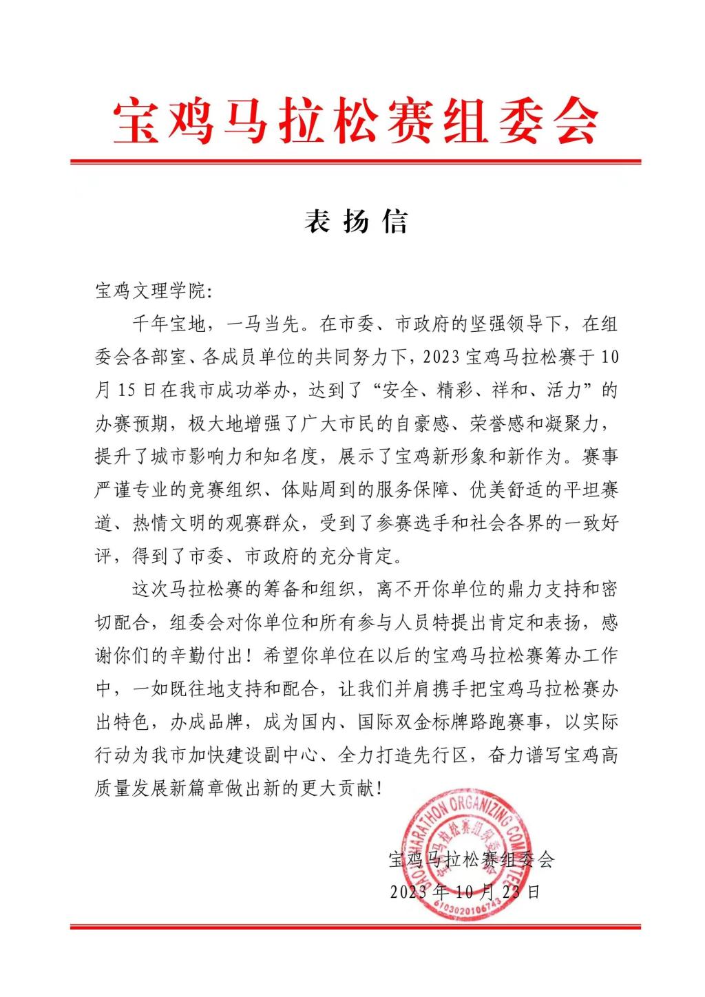 近日,beat365官网收到了宝鸡马拉松赛组委会表扬信,表扬了beat365官网体育学院30余名师生助力马拉松起点启动仪式和半程终点啦啦操表演,展现了beat365官网师生良好的精神风貌,为宝鸡体育发展贡献了宝文理力量,受到了社会各界的一致好评。