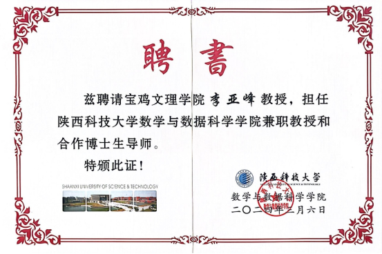 近日,beat365官网计算机学院李亚峰教授受聘为陕西科技大学数学与数据科学学院兼职教授和合作博士生导师,增进了beat365官网与其他高校的学术交流,提升学校的学术影响力。(申请博士学位授权单位工作办公室、计算机学院 文、图/樊攀 审核/孙宏健、张光南)