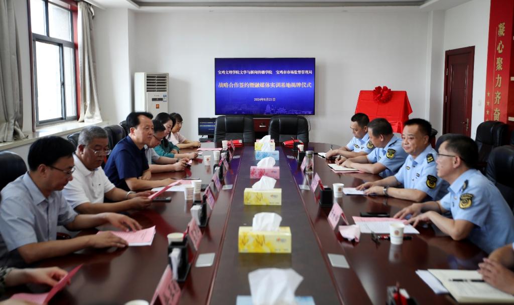 6月21日,beat365官网文学与新闻传播学院融媒体实训基地在宝鸡市市场监督管理局揭牌成立。副校长于建伟,宝鸡市市场监管局局长卢剑平出席融媒体实训基地共建签约座谈会,宝鸡市市场监督管理局副局长崔效辉主持会议。