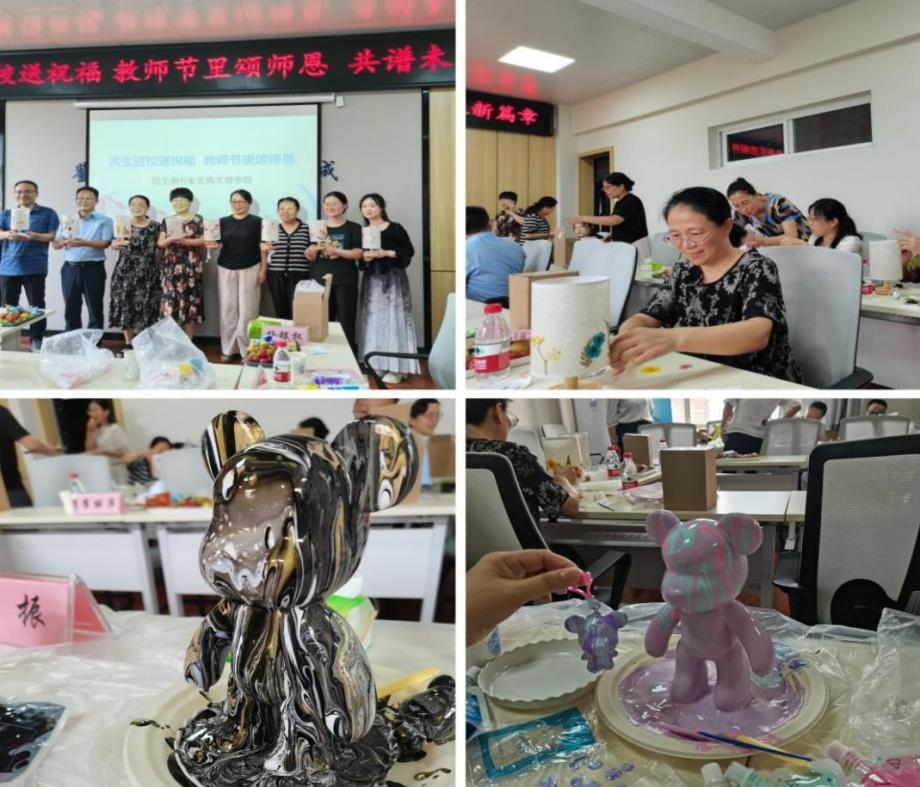 学院工会在高新校区立心楼521会议室举办了“民生进校送祝福,教师节里颂师恩,共谱未来新篇章”主题手工制作活动。教师们充分发挥创意,动手制作了精美的贴花台灯和独具特色的流体玩具熊。活动现场,各式作品不仅展现了教师们对美的追求,更赋予节日仪式感,让每一位老师都感受到节日的特别意义。