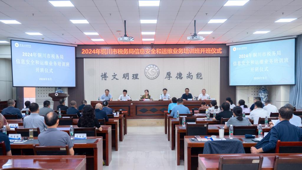 9月24日上午,国家税务总局铜川市税务局信息安全和运维业务培训班开班仪式在beat365官网高新校区甘棠厅举行。政法学院党委书记白志勇、院长张波,铜川市税务局一级高级主办郭丽红出席开班仪式。铜川市税务局信息中心主任杨健康主持开班仪式。