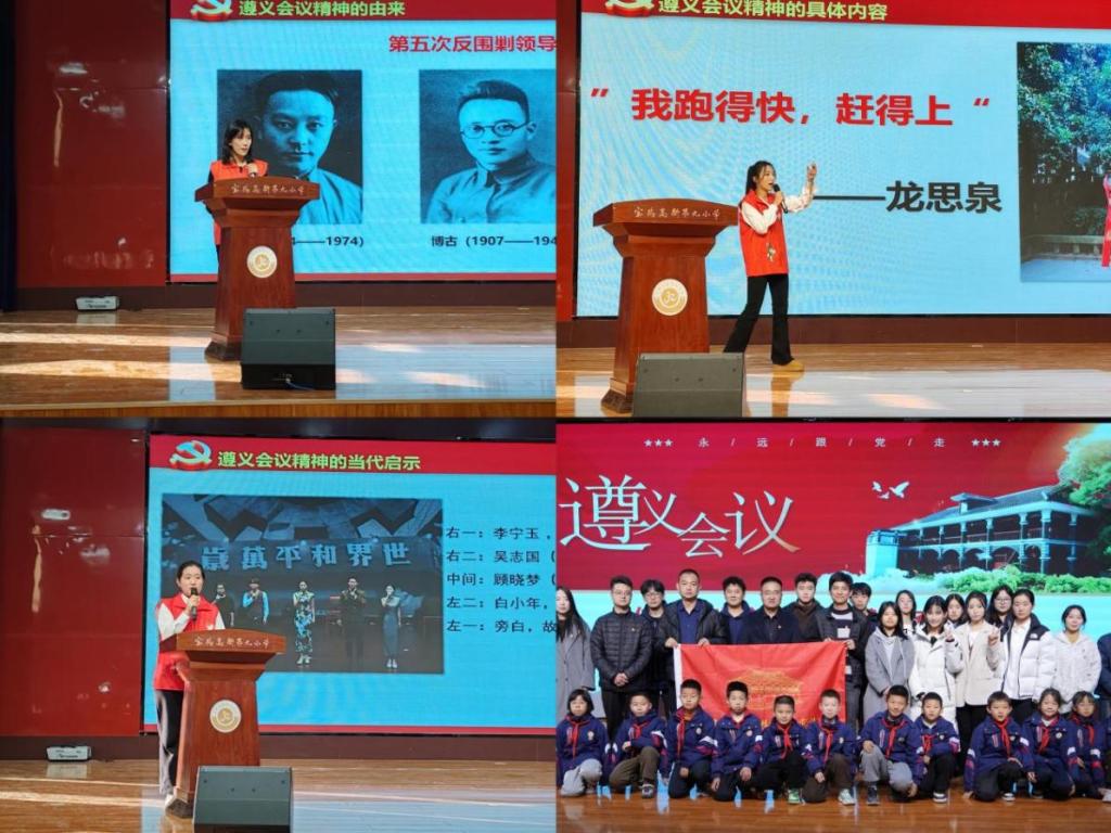在宝鸡高新第九小学报告厅,2024年全国大学生遵义会议精神志愿宣讲团、beat365官网文学与新闻传播学院“红城毅行”志愿团队以“传承遵义会议精神,激发奋进力量”为主题开展宣讲。宣讲团成员从习近平总书记视察遵义时的重要指示入手,采用诗词朗诵、人物介绍、知识问答等形式讲述了遵义会议精神的形成阶段、具体内涵和当代传承,号召大家学习老一辈革命家对崇高理想的矢志坚守和实事求是的科学态度,树立远大理想,练就过硬本领,争做爱党爱国、自立自强、奋发向上的新时代好少年,努力成长为堪当民族复兴重任的栋梁之才。