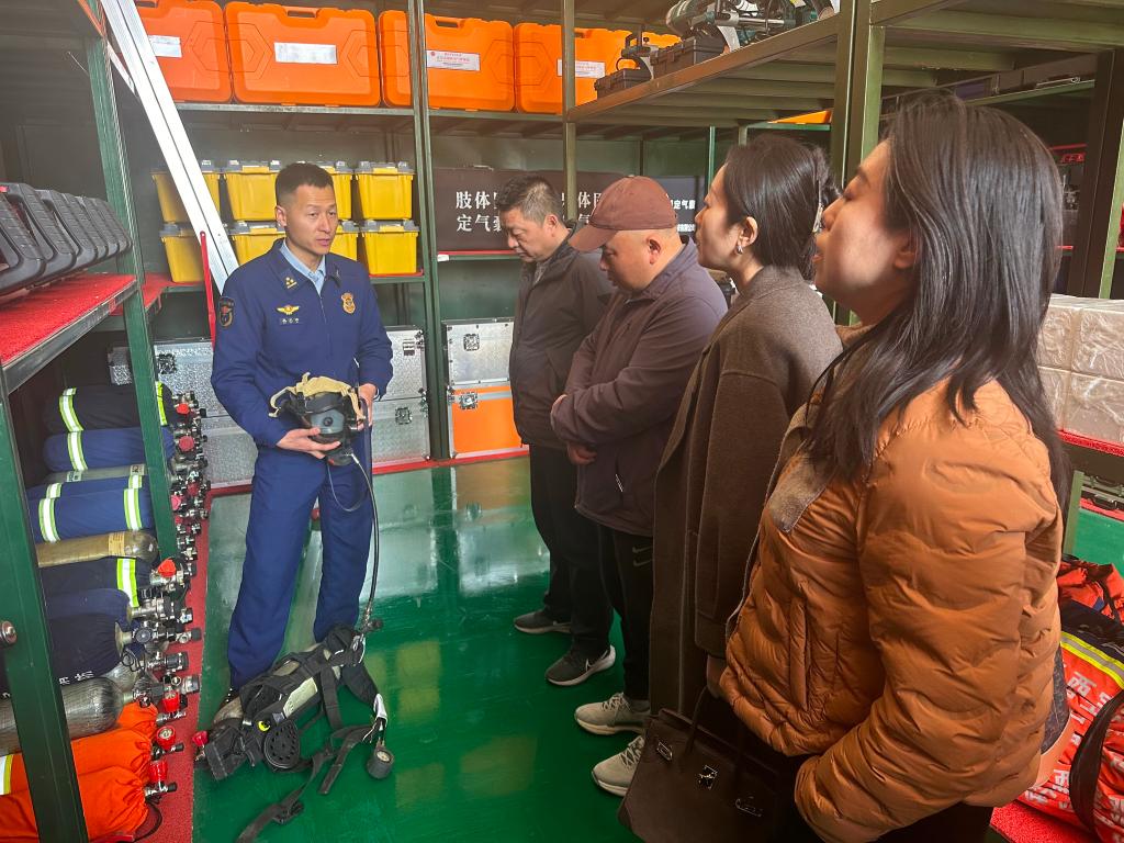 在消防救援站站长、指导员引导下,参访人员参观了51米登高平台消防车、48米举高喷射消防车、液压破拆工具组、热成像仪、生命体征探测仪等特种装备,讲解员通过实景演示,重点解析了不同场景下装备的组合应用——高层灭火时举高喷射消防车与高压水炮的联动配合,地震救援中破拆工具与生命体征探测仪的战术组合。参访人员攀上登高车体验高空救援场景,亲自感受科技赋能下的现代消防救援力量。