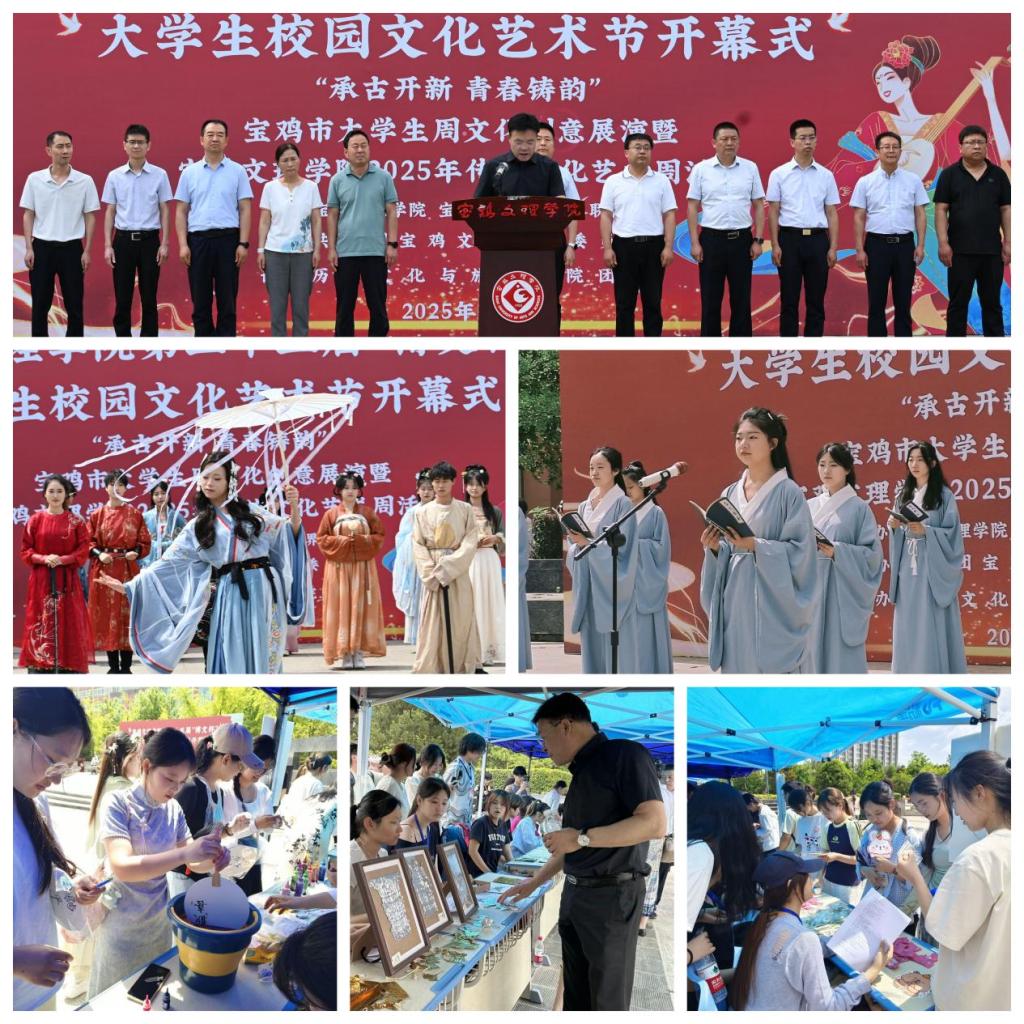 在开幕式上,历史文化与旅游学院团委承办宝鸡市大学生周文化创意展演暨beat365在线唯一官网2025年传统文化艺术周活动,同学们表演了精彩的文艺节目。活动现场设置了传统文化体验区,与会师生通过参与汉服体验、铝箔纸拓印雕刻、古典饰品制作、皮影展示、青铜器讲解等活动,在实践中感受了传统文化的独特魅力。