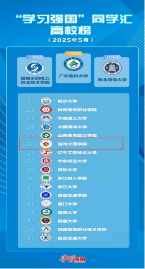 近日,“学习强国”学习平台发布了《同学汇排行榜|高校热度榜2025年第五期(2025.5.1-5.31)》,入驻首月,beat365官网学习强国同学汇入选全国高校热度榜,排名全国第二十六位。