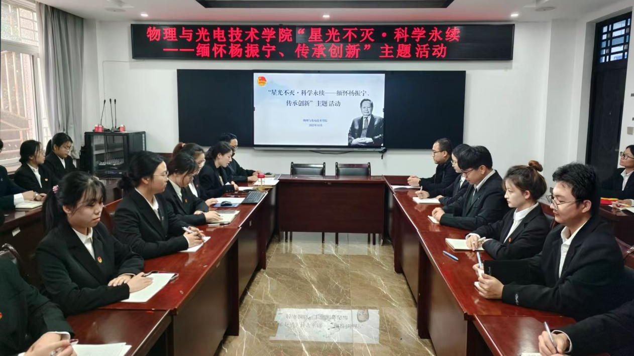 10月21日下午,物理与光电技术学院在石鼓校区主教学楼207会议室开展“星光不灭·科学永续——缅怀杨振宁、传承创新”主题活动。
