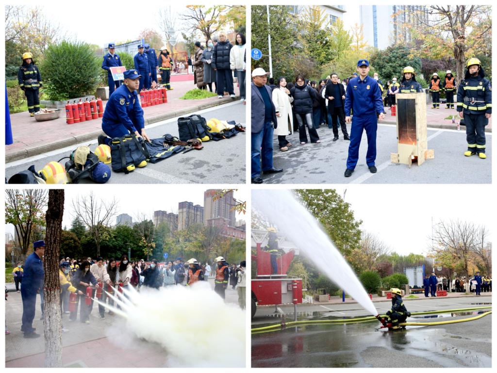 在安全区域集合清点人数后,消防队员进行了消防装备和消防车水炮灭火操作展示,指导师生代表使用灭火器灭火等实践操作,并详细讲解了日常学习生活中的火灾隐患、初期火灾的扑救方法、紧急疏散的注意事项等消防知识。
