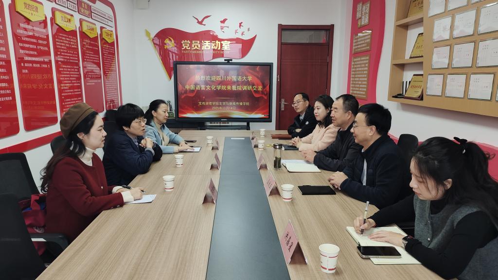 张红亮系统介绍了文学与新闻传播学院党建工作的发展历程与特色成果。文学与新闻传播学院院长孟改正对学院发展历史、学科建设和教学科研情况做了详细介绍。薛红介绍了四川外国语大学中国语言文化学院党建工作的特色做法与实践经验。双方聚焦“党建与业务融合路径创新”主题,分别就教工党支部“双带头人”工作室建设、学生党员先锋岗设置、红色文化育人体系构建、学科科研协同发展、人才培养、毕业生就业等具体工作展开研讨,分享了党员队伍管理、党建活动设计、校企(地)合作等方面的实操经验。