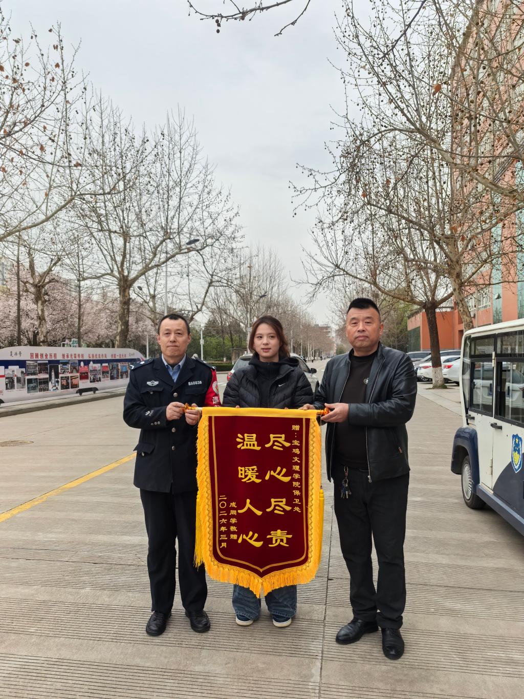 3月19日上午,保卫处收到了体育学院学生成之远送来的印有“尽心尽责、温暖人心”的锦旗,体现出学生对安保人员快速寻回失物的真挚感谢和高度认可。