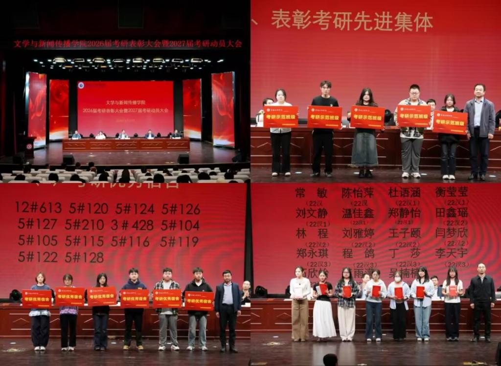 4月27日晚,文学与新闻传播学院在高新校区博文楼报告厅召开2026届考研表彰暨2027届考研动员大会。会议由学院党委副书记、副院长马睿主持。