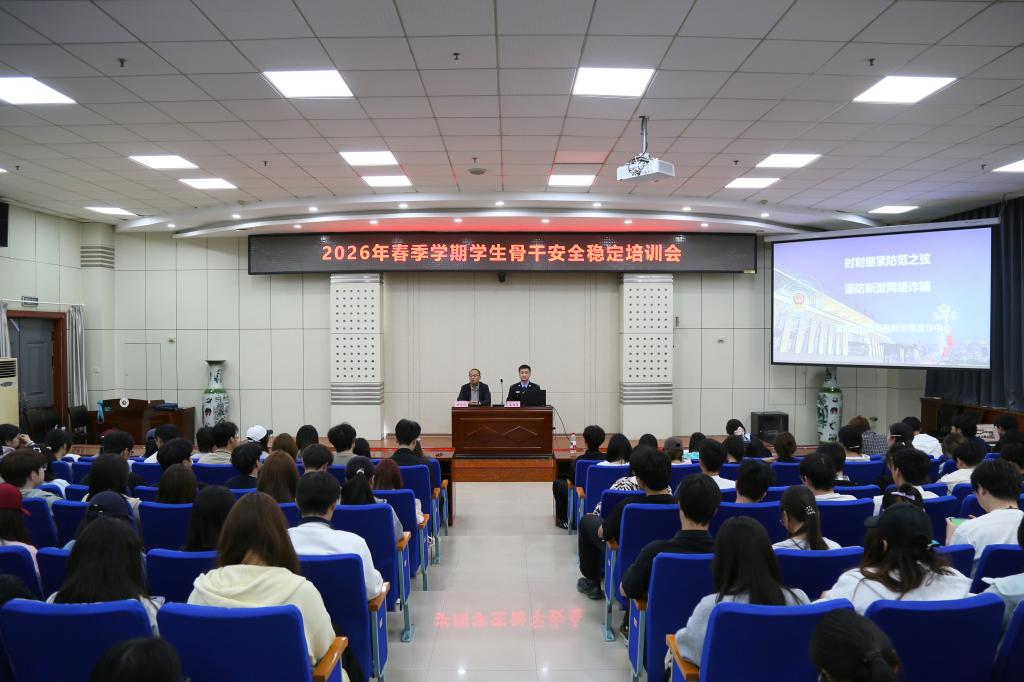 4月28日下午,学校“一站式”学生社区党工委、保卫处在高新校区木铎厅联合举办2026年春季学期学生骨干安全稳定培训会,宝鸡市公安局高新分局反诈中心民警王旌臣应邀作专题培训。“一站式”学生社区党工委委员杨子祁主持会议。