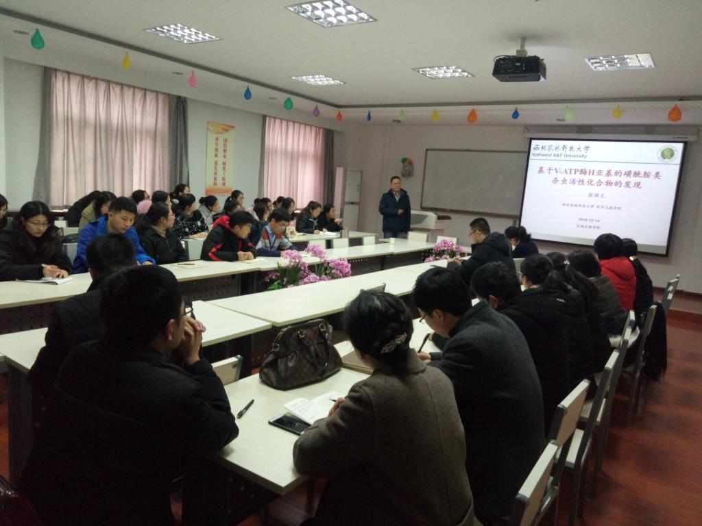 12月14日下午,西北农林科技大学化学与药学院博士生导师张继文教授应邀在beat365官网明理楼6楼化学化工学院会议室作了题为《基于V-ATP酶H亚基的磺酰胺类杀虫活性化合物的发现》的学术报告,化学化工学院教师、研究生50余人聆听了报告,报告会由化学化工学院院长凡明锦主持。