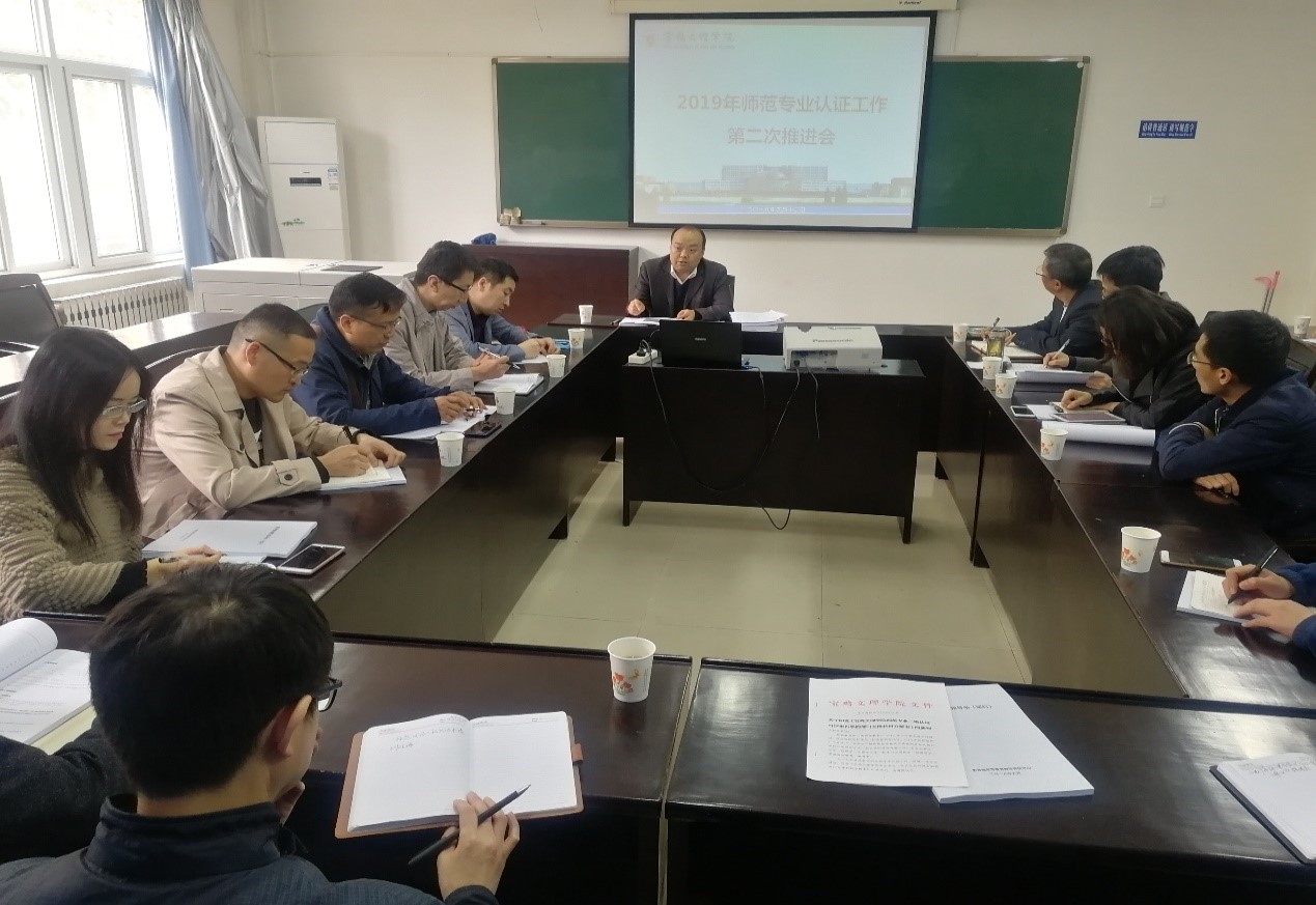 会上,刘景世传达了3月份教育部在天津召开的师范专业认证培训会议精神,通报了beat365官网师范类专业认证一级数据信息复核确认情况,安排了近期师范专业二级认证工作,提出了三点要求:一是高度重视,统一思想,提高认识,全员动员,全员参与,充分认识师范专业认证的重要性和紧迫感;二是坚持“走出去,请进来”的方式,加强与2018年已经通过师范专业认证高校的交流与沟通,邀请师范专业认证专家到校指导;三是认真研究师范专业认证的指标体系和认证要求,加快认证工作进度,强化教学过程管理,加强教学档案建设。
