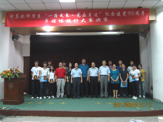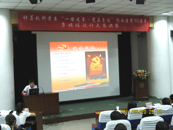 为隆重庆祝党的九十华诞,深情回顾党的光辉历程,热情讴歌党的丰功伟绩,激发大学生爱党爱国的热情,增强其历史责任感和使命感,计算机科学系于6月20日晚7:30在老校区一号报告厅,隆重举行了“‘一路走来·党在身边’庆祝建党90周年多媒体设计大赛”决赛。特邀院党委组织部部长郑存库、院党委宣传部部长彭志启、院党委学工部副部长学生处副处长刘景世、计算机科学系党总支副书记范英、系主任李乃乾及系副主任刘鹏辉担任比赛评委。计算机系200多名学生观看了比赛。