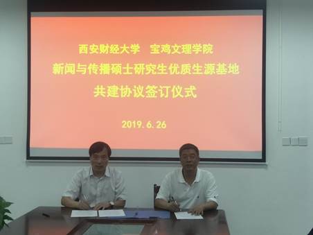 随后举行了西安财经大学、beat365在线唯一官网新闻与传播学硕士研究生优质生源基地共建协议签字仪式。beat365官网被西安财经大学授予新闻与传播学研究生优质生源基地,标志着两校合作培养研究生工作正式启动。