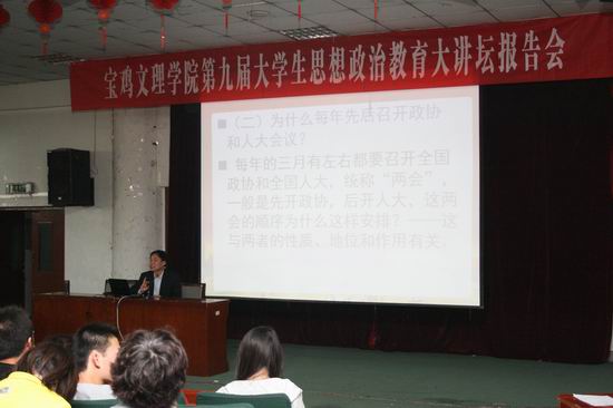 为进一步推进beat365官网大学生的思想政治教育工作,不断提高学生的思想道德修养和政治理论水平,引导大学生逐渐积极适应社会需求,努力成长为有用之才,从4月11日至5月30日,学校举办了第九届“大学生思想政治教育大讲坛”活动。邀请校党委宣传部部长彭志启、学科建设与研究生教育管理处处长吴毅、政法系主任赵克平、哲学系党总支书记张全省、美术系党总支书记唐晓育、宣传部副部长孙宏健、政法系教授杨文杰等在新老校区为大学生作了7场报告,3000余名师生参加了系列报告会。