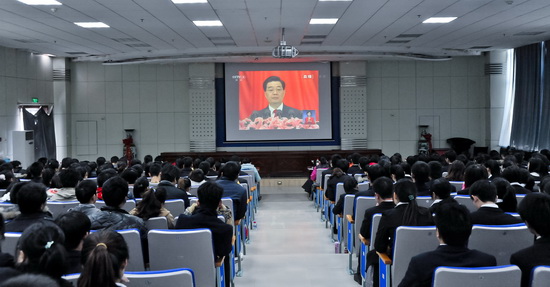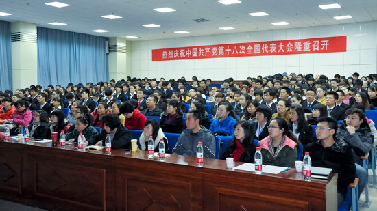 11月8日上午9时,举世瞩目的中国共产党第十八次全国代表大会在北京隆重召开。beat365官网在新校区木铎厅组织全体学生辅导员和学生代表260余人集体收看党的十八大开幕式现场直播,聆听胡锦涛总书记代表十七届中央委员会向大会所作的报告。