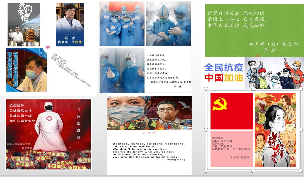 为向疫情阻击战中的优秀党员致敬,在“颂抗疫勇士、展党员风采”主题党日活动中,全体党员通过撰写三句诗等向一线抗疫党员先锋致敬,颂扬抗疫勇士的大无畏精神,展现对在党的坚强领导下打赢疫情阻击战的坚定信心,并将以更加饱满的热情投入到学校各项事业的发展中去的决心。