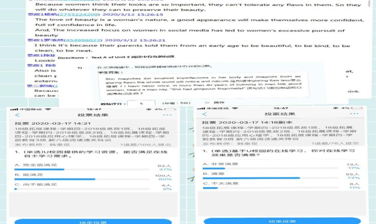 以腾讯课堂为支撑,紧密结合U校园和QQ群的使用,完成教学重点和问题集中反馈。腾讯课堂为腾讯公司提供的免费教学平台,提供了屏幕分享和PPT演示的在线直播功能。在教学过程中,通过将腾讯课堂的在线直播、签到、答题卡、举手等功能与U校园的提问、投票功能的合理运用,加强师生间的互动,保证了教学过程的有效开展。同时在直播教学中,教学重点除了完成课程教学要求外,紧密结合学生在U校园在线学习中反映的问题,开展有针对性的直播教学,提升学生的学习效果。(外国语学院 文/李伟 图/韩秦俊 审核/王卫强)