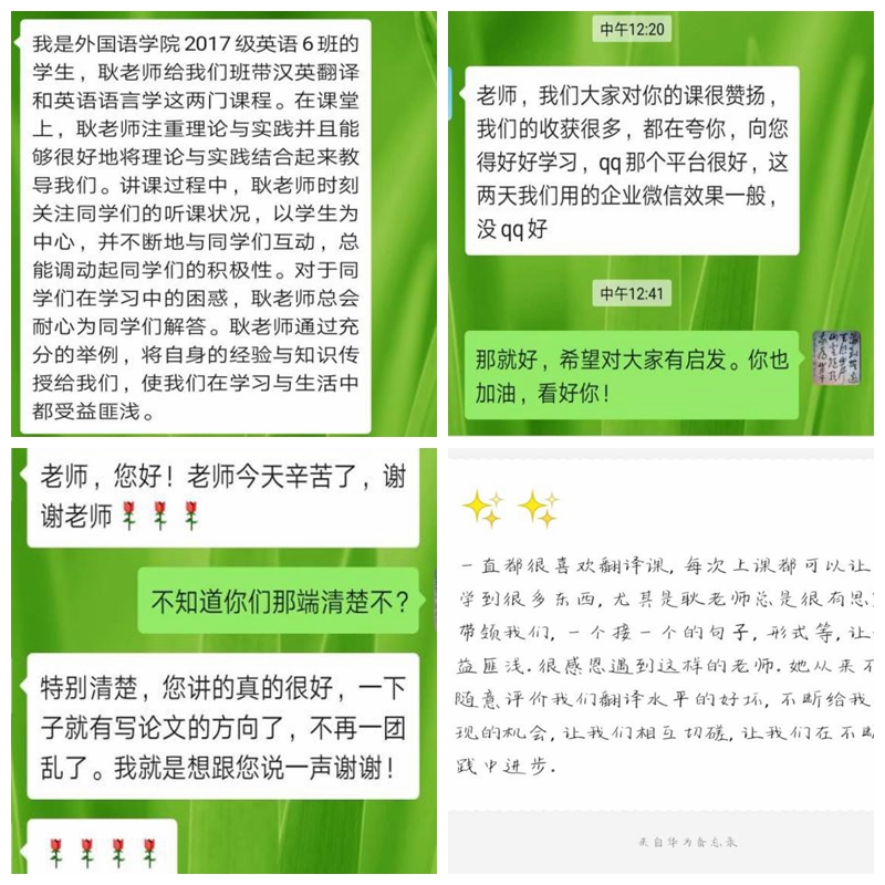 作为学院教学督导组副组长,在网络授课期间,耿秀萍老师随时关注学生的学习状况,及时了解网络授课的教学效果,询问学生的反馈意见,不断完善和改进教学方法,所授课程也得到学生的认可。学生和其他校级教学督导也给耿老师发来了反馈信息。