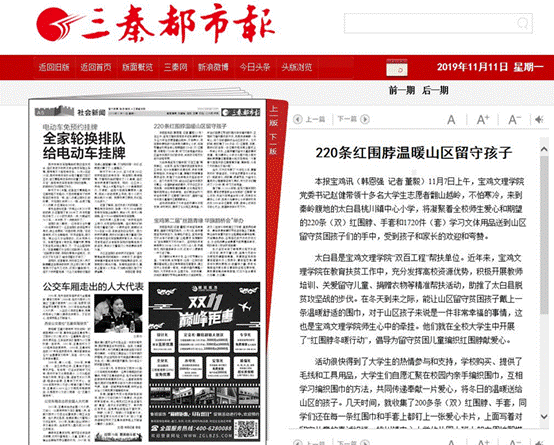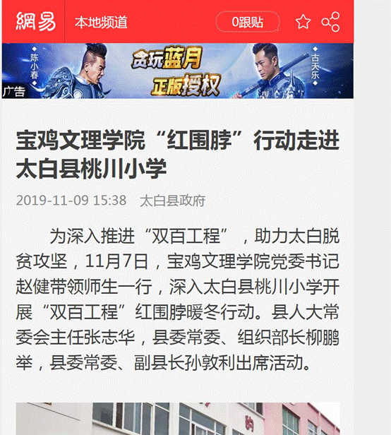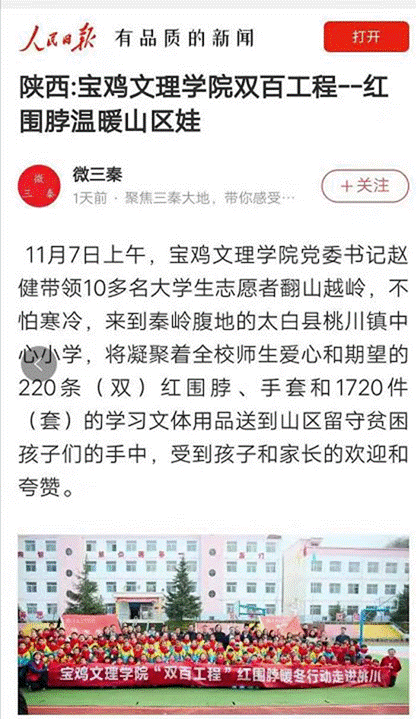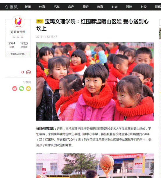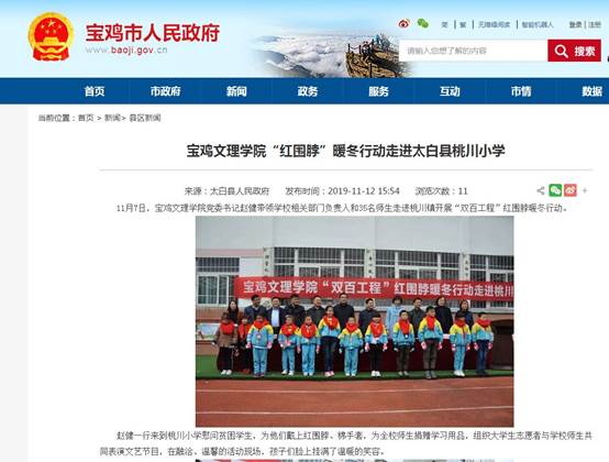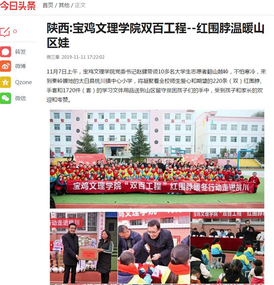 近日,beat365官网开展的“双百工程”“红围脖暖冬行动”走进太白县桃川小学活动,分别被《人民日报新媒体平台》《今日头条》《凤凰网》《三秦都市报》等11家媒体报道。(党委宣传部 文、图/韩恩强 审核/冯飞龙)