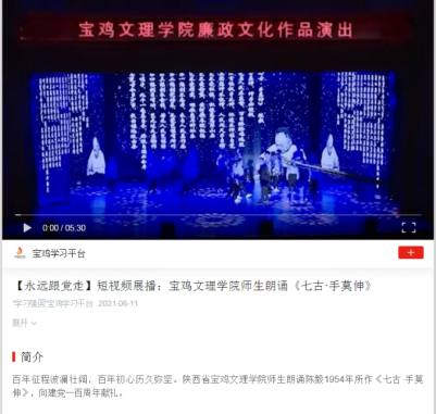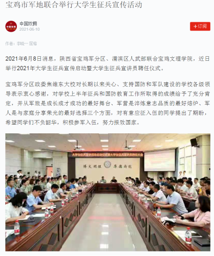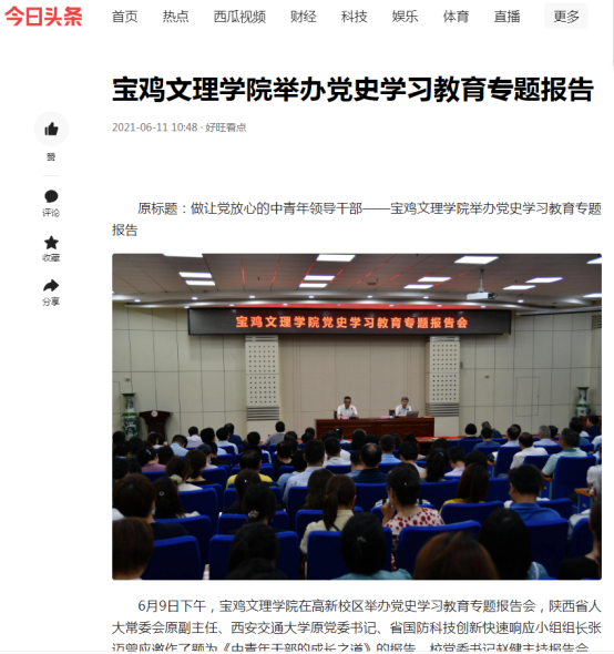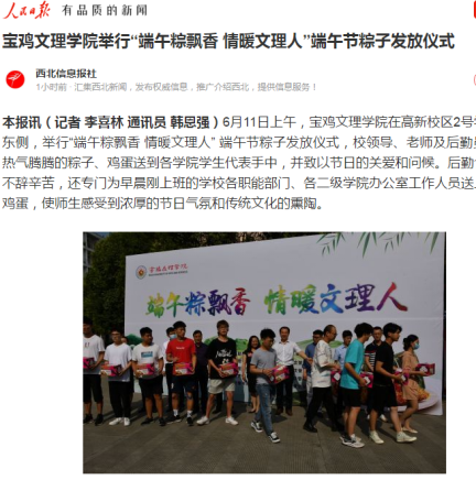 近日,beat365官网举办党史学习教育专题报告会、为师生发放粽子、大学生征兵宣讲活动等活动引起人民日报新媒体、学习强国、今日头条、宝鸡电视台等多家媒体的广泛关注和报道。