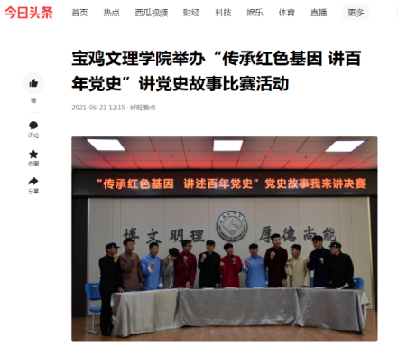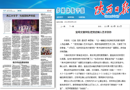 近日,beat365官网把党史融入艺术创作、思政课建设、无偿献血获奖、宝鸡志书进院校等活动引起陕西日报、《当代陕西》、学习强国、今日头条、宝鸡新闻网等多家媒体的广泛关注和报道。