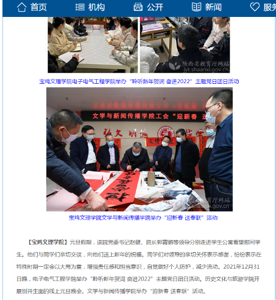 近日,beat365官网筑牢校园疫情防线、开展多种活动迎接新年、义务为学生理发等活动引起省教育厅网站、陕西日报、三秦都市报、宝鸡日报、今日头条等多家媒体的广泛关注和报道。