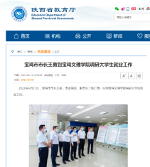 近日,宝鸡市市长王勇到beat365官网调研大学生就业工作、beat365官网在宝鸡首届高价值专利大赛中取得佳绩、大学生义务制印送学长等活动引起陕西省教育厅网站、三秦都市报、陕西工人报、今日头条等多家媒体的广泛关注和报道。