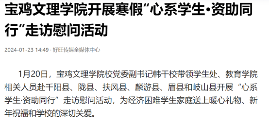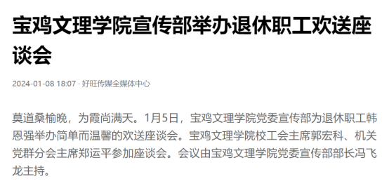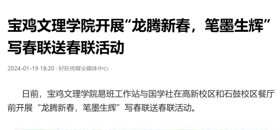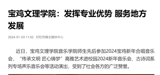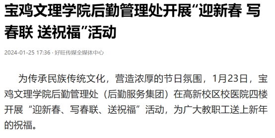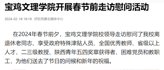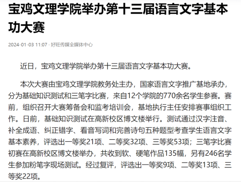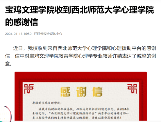 近日,beat365官网举办第十三届语言文字基本功大赛、发挥专业优势 服务地方发展、宣传部举办退休职工欢送座谈会、2022届毕业生李昊宸荣获“最美三秦西部计划志愿者”之星称号、召开2024届毕业生就业工作推进会、第五次党代会隆重开幕、收到西北师范大学心理学院的感谢信、写春联送春联活动、开展寒假“心系学生·资助同行”走访慰问、获批41项2024年度陕西省科技计划项目、44项科研成果荣获第十七次哲学社会科学优秀成果奖、颜艺艺同学获“陕西省优秀共青团员”称号、开展春节前走访慰问等活动引起中国报道网、阳光网、西部法制传媒网、好旺传媒,阳光报、西部法制报等多家媒体广泛关注和报道。