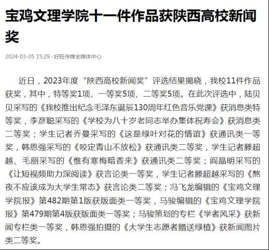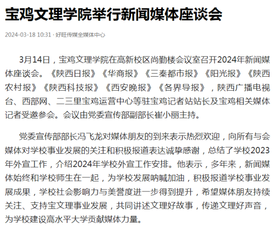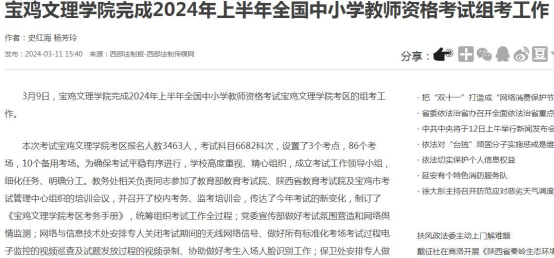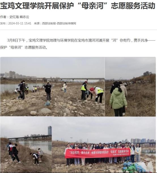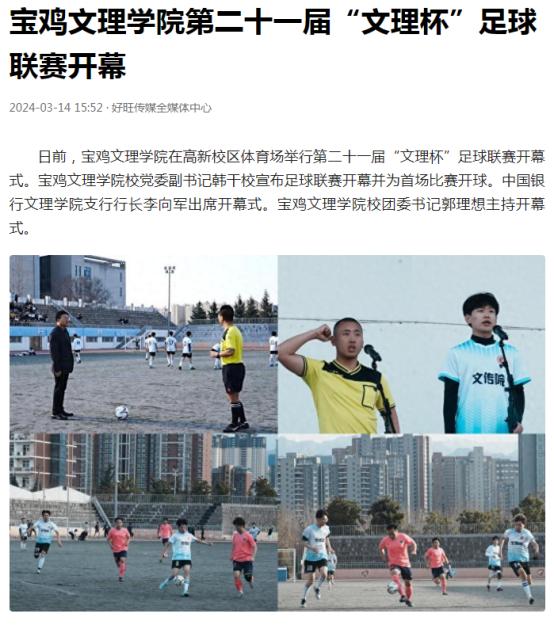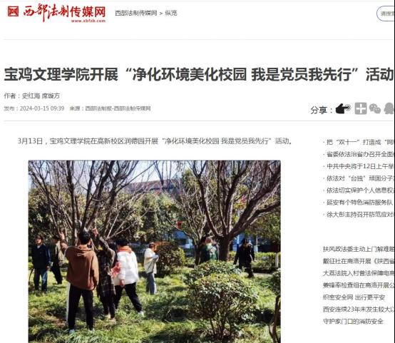 近日,beat365官网召开2024年工作安排部署会、与北星博辉科技公司举行校企合作座谈会、十一件作品获陕西高校新闻奖、五个单位来信感谢beat365官网政法学院师生、开展保护“母亲河”志愿服务活动、完成2024年上半年全国中小学教师资格考试组考工作、第二十一届“文理杯”足球联赛开幕、开展“净化环境美化校园 我是党员我先行”、志愿者参与“童年一课”线上支教、举行2024年陕西省“大思政课”教学观摩研讨会等活动引起陕西日报、省教育厅网站、阳光网、西部法制传媒网、好旺传媒等多家媒体广泛关注和报道。