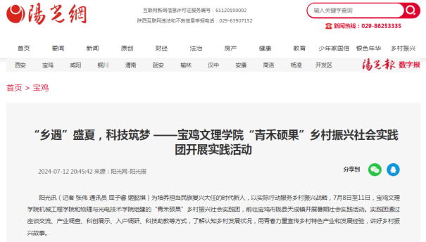 近日,学校举行庆祝中国共产党成立103周年暨“七一”表彰大会、代表团前往马来西亚和新加坡开展校际合作交流、举行2024年大学生暑期文化科技卫生“三下乡”社会实践活动出征仪式、与宝鸡市础石金属检测有限责任公司签订校企合作战略协议、宝鸡市低空智能飞行研究院揭牌成立、大学生青铜器志愿讲解团队获青年志愿服务项目赛铜奖、开展“美丽中国 青春行动”专项暑期社会实践活动、组织师生赴茵香河文化旅游区开展暑期社会实践活动、开展“艺路有你相伴 助力文化振兴”暑期社会实践活动、前往陇县开展实践调研活动、“青禾硕果”乡村振兴社会实践团开展实践活动等引起陕西省教育厅-新闻-热点聚焦、中国周刊网、阳光报、阳光网、陕西科技传媒网、宝鸡一点通-宝鸡市融媒体中心等多家媒体广泛关注和报道。