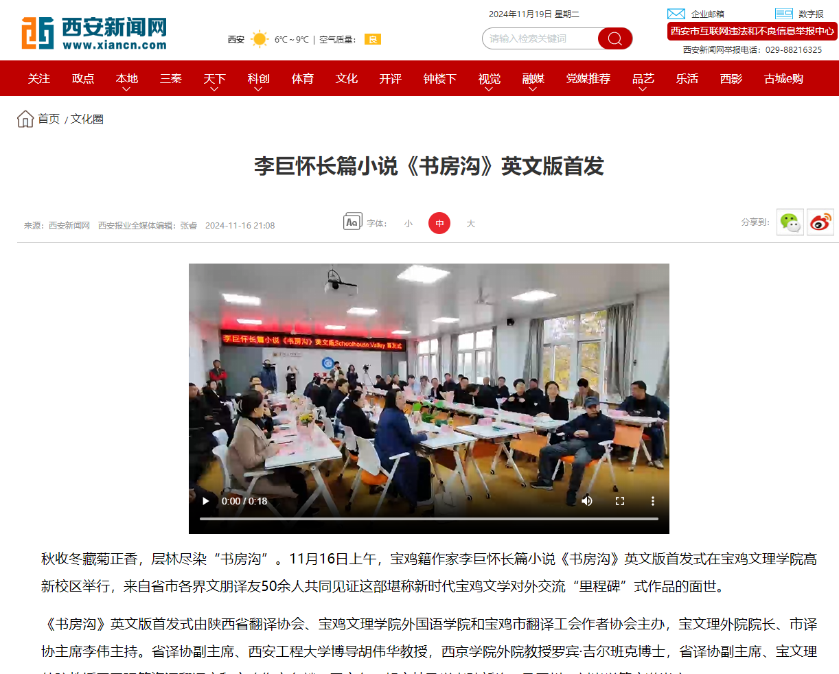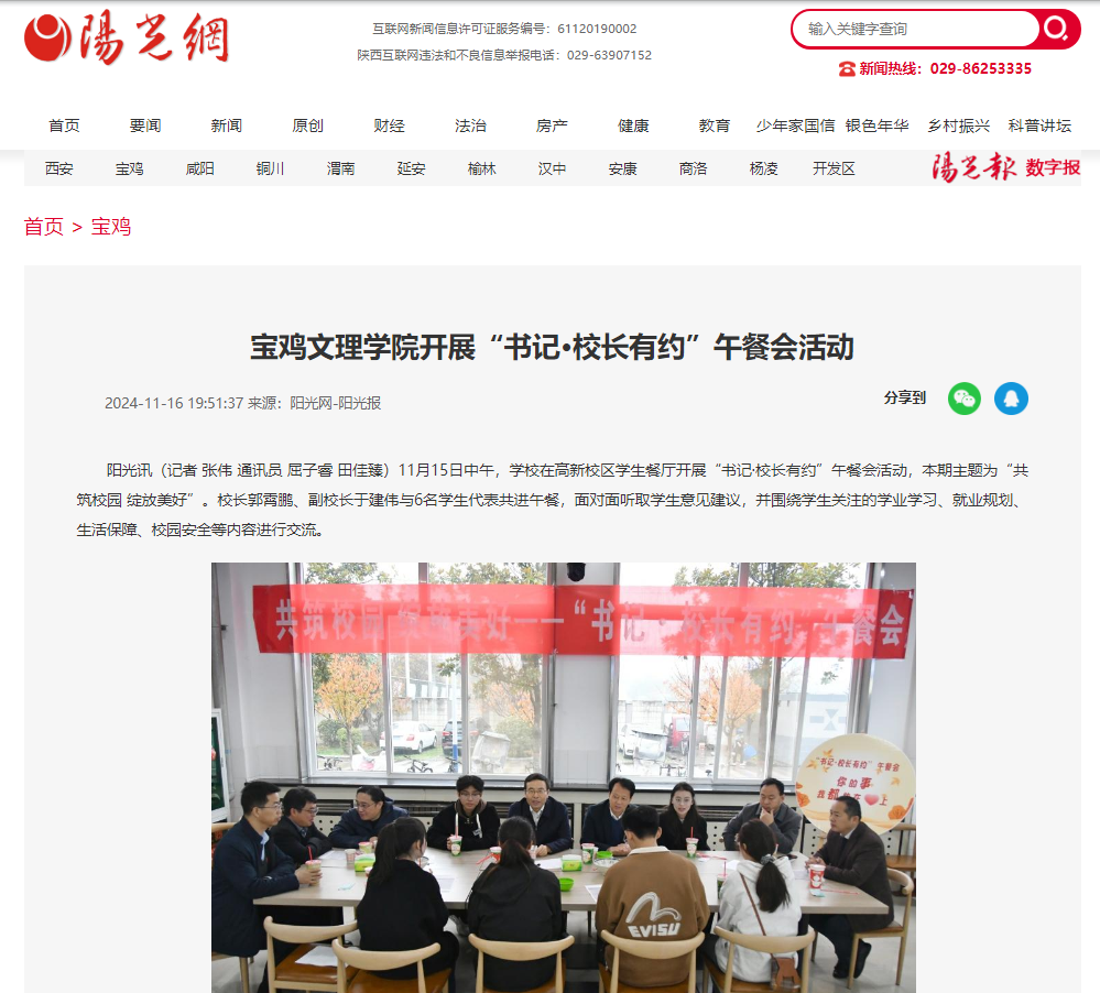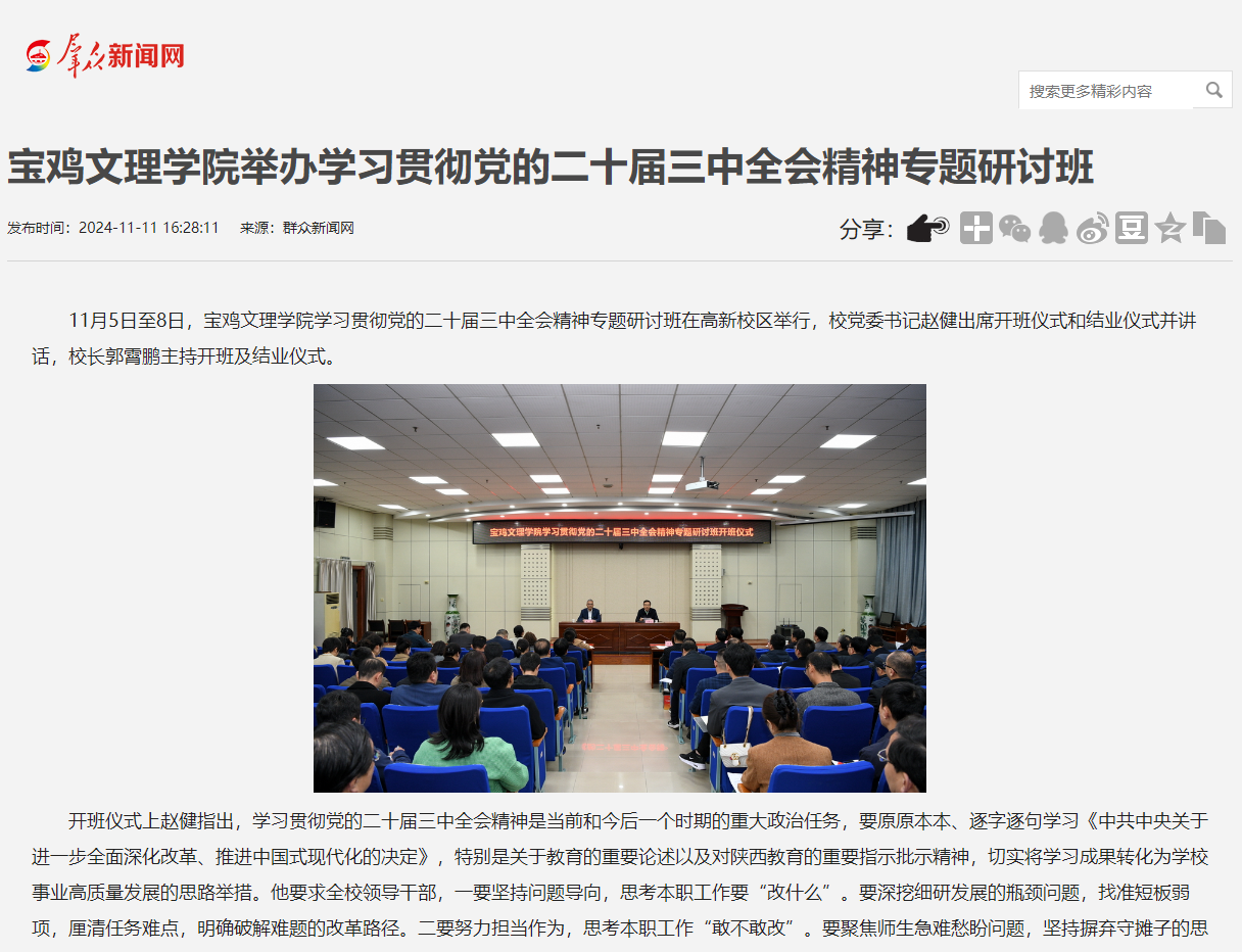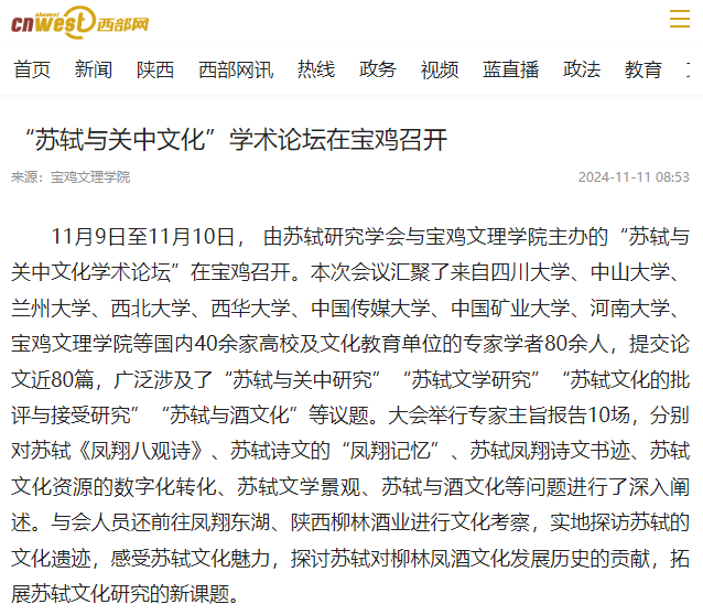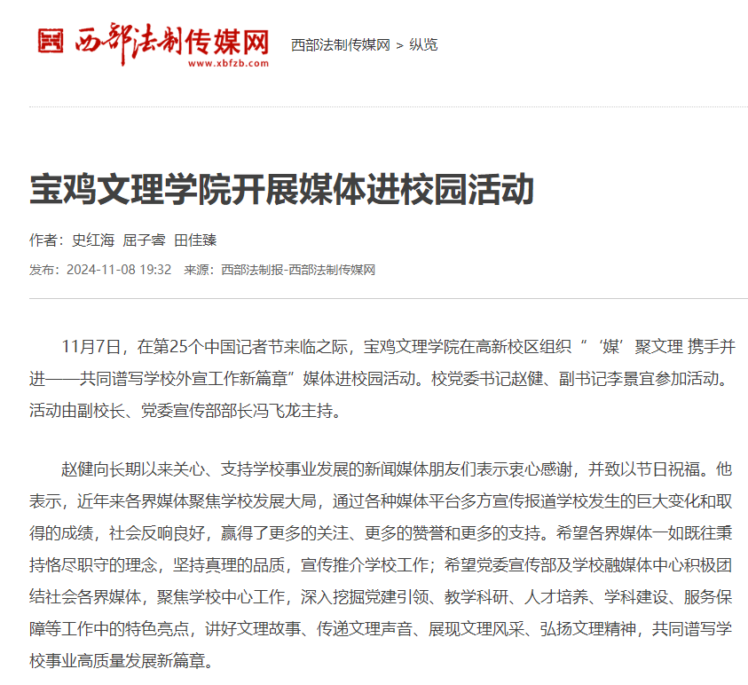 近日,beat365官网举办学习贯彻党的二十届三中全会精神专题研讨班,推进“双一流”建设,开展“书记·校长有约”午餐会活动,举办媒体进校园活动,开展第33个全国消防日活动,主办“苏轼与关中文化”学术论坛,举办廉洁教育校园展,举行李巨怀长篇小说《书房沟》英文版首发式,师生前往宝鸡青铜器博物院开展教学实践活动,报道“教学名师”李艳颖等活动引起学习强国、陕西省教育厅、西部法制报、各界新闻网、起点新闻、群众新闻网、阳光网、民生网、西部网、城市金融网、陕西头条、西安新闻网、掌上宝鸡、今日头条等多家媒体广泛关注和报道。