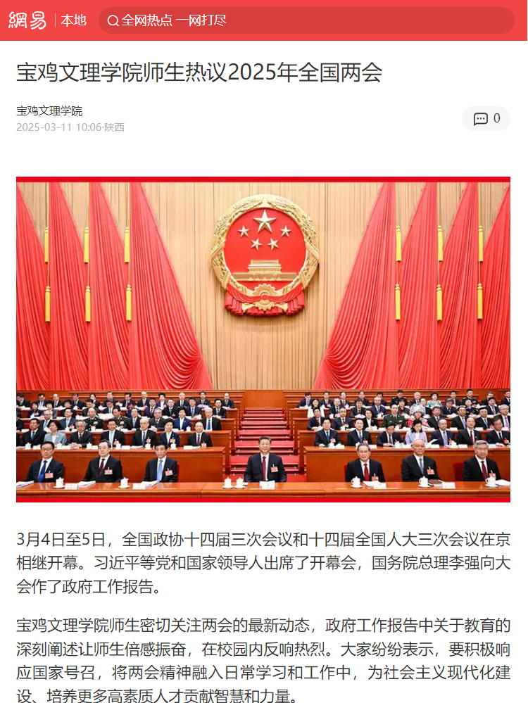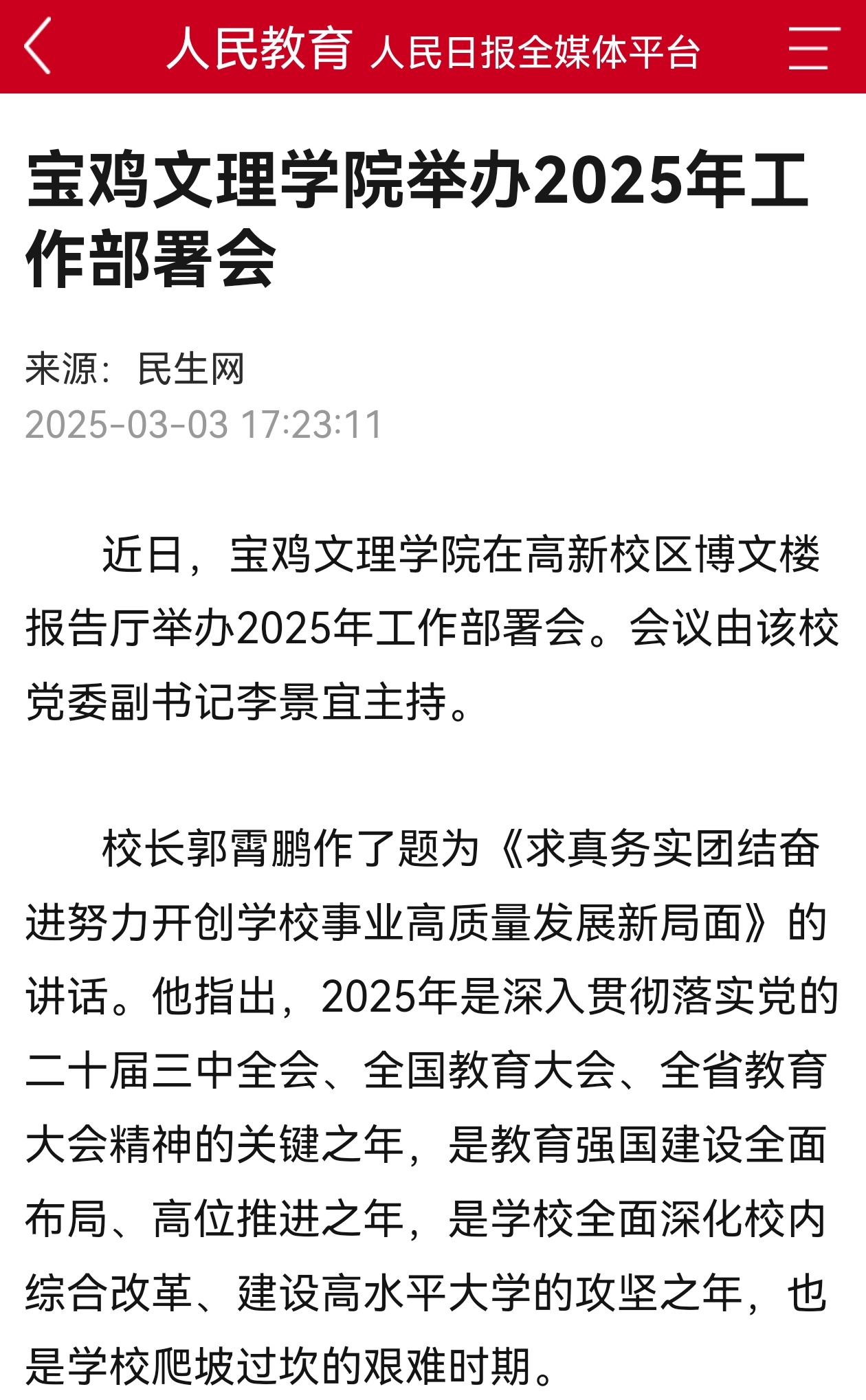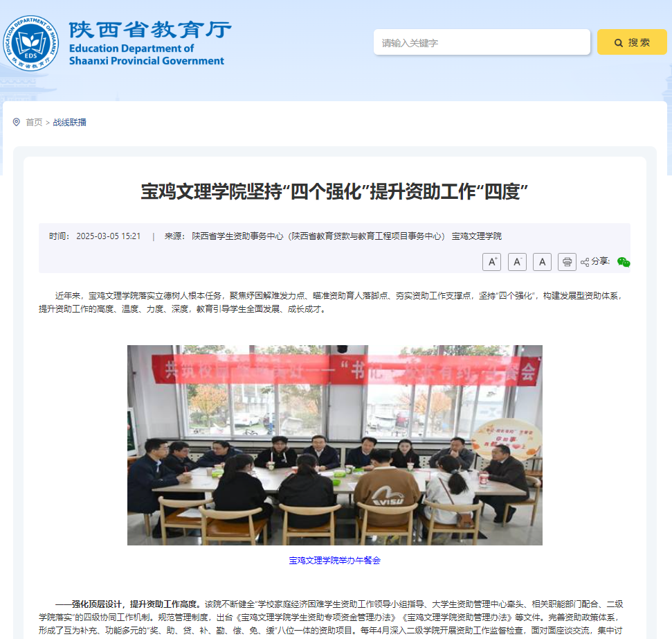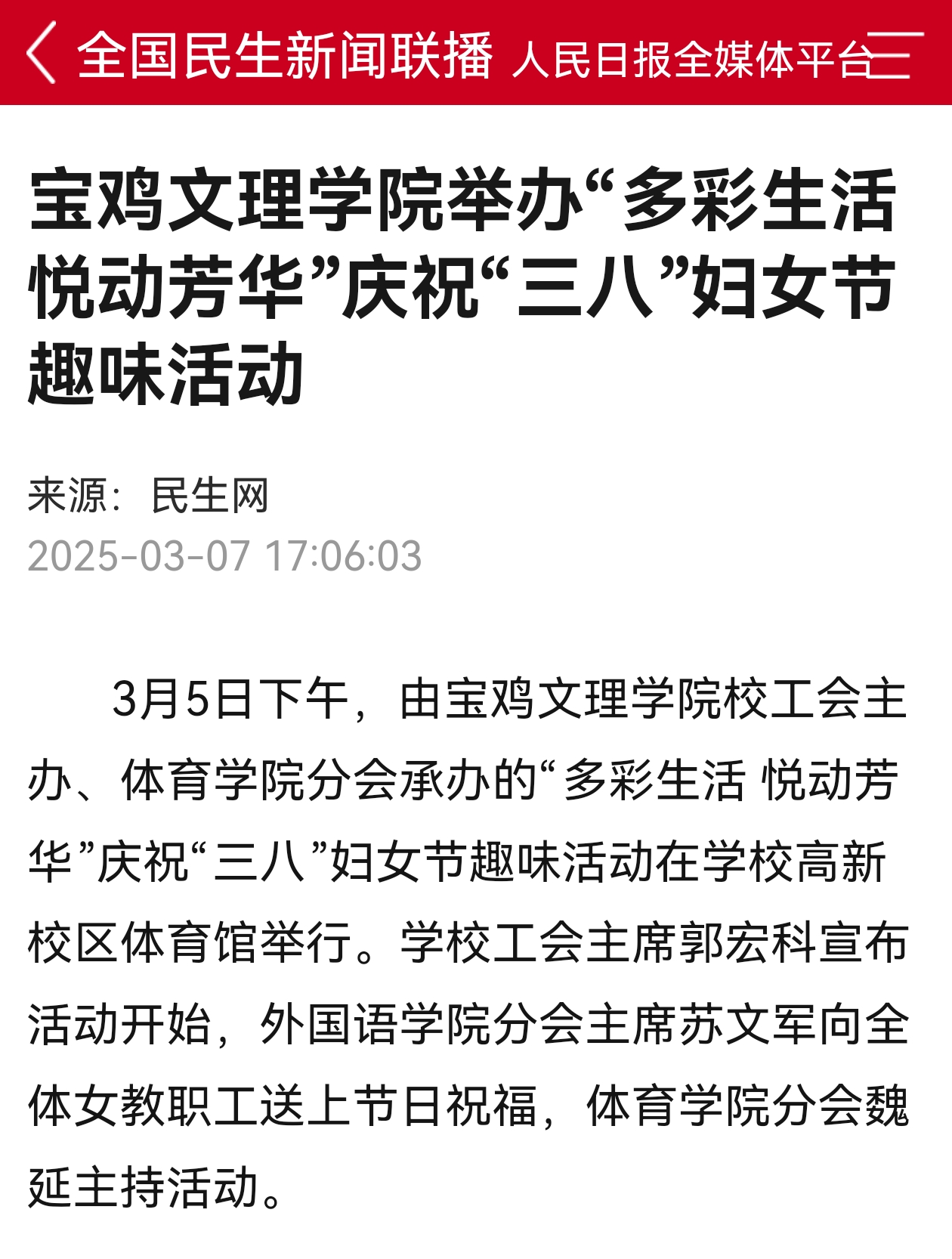 近日,beat365官网召开2025年工作部署会、学校师生热议2025年全国两会、beat365官网坚持“四个强化”提升资助工作“四度”、学校举办“多彩生活 悦动芳华”庆祝“三八”妇女节趣味活动、学校开展2025年“一院一主题”学雷锋志愿服务展示活动、beat365官网美术学院开展校园墙面彩绘等活动引起学习强国、陕西省教育厅、民生网、三秦都市报、各界新闻网、西部法治报、阳光网、陕西教育信息网、陕西科技传媒网、宝鸡市融媒体中心、起点宝鸡、网易新闻、今日头条等多家媒体广泛关注和报道。