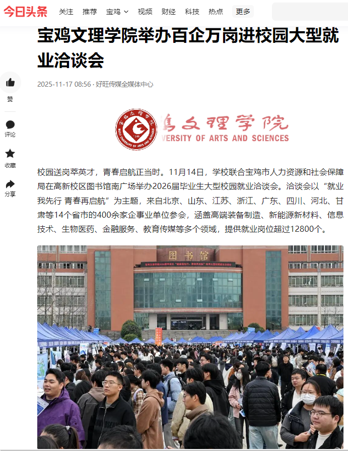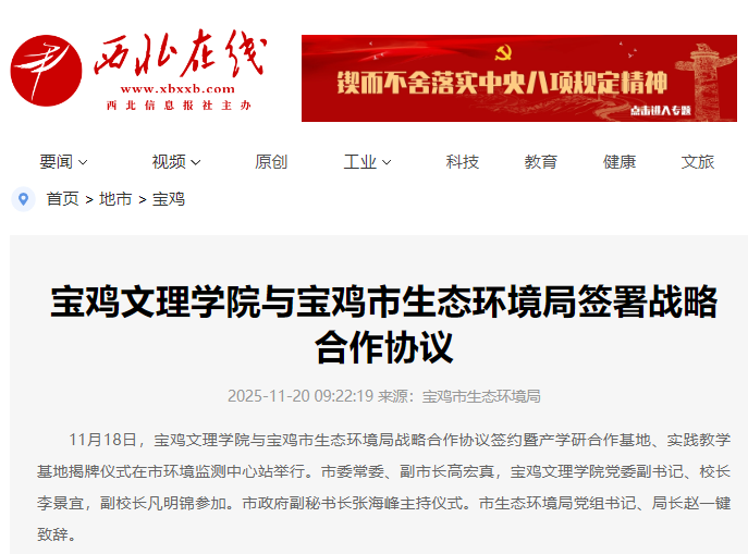近日,学校开展“到延安去”·三秦学子圣地行教育活动、大学生社会实践基地在红光沟航天精神文化区揭牌、校友王佳佳为山区学生教授街舞受到广泛关注与赞誉、学校举办百企万岗进校园大型就业洽谈会、3个基层党组织入选第五批新时代陕西高校党建“双创”工作培育创建单位、与陈仓区人民检察院启动“检校合作与服务项目”、与宝鸡市生态环境局签署战略合作协议、纪念抗战胜利80周年舞台美术作品展在beat365官网开幕、学校举行“AI视域下陕西当代文学研究高层论坛暨年度工作会议”等活动引起中央电视台、学习强国、西部法治报、西北在线、阳光网、陕西农村网、中华网、西铁宝鸡东站、今日头条等多家媒体广泛关注和报道。
