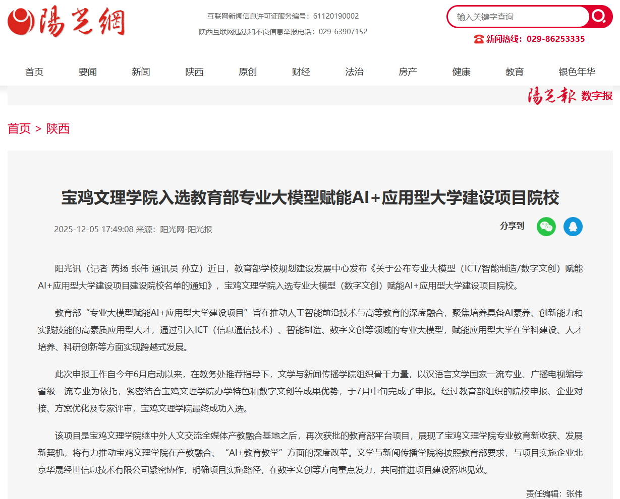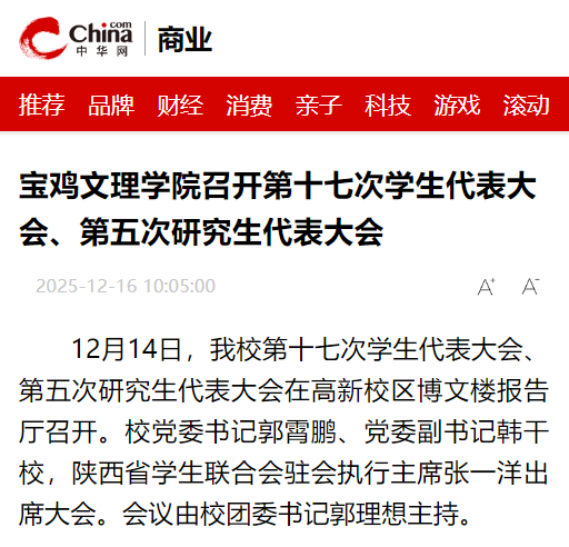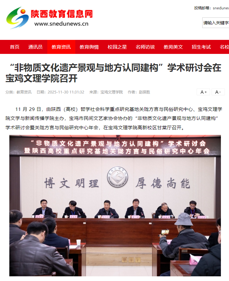 近日,学校召开第十七次学生代表大会、第五次研究生代表大会,入选教育部专业大模型赋能AI+应用型大学建设项目院校,全力做好访企拓岗促就业各项工作,“绿色无毒 法润三秦”百场行关中专场走进beat365官网,“非物质文化遗产景观与地方认同建构”学术研讨会在学校召开等活动引起陕西教育信息网、阳光网、三秦都市报、起点新闻、视界观、中华网、今日头条等多家媒体广泛关注和报道。