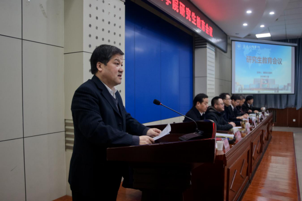 校党委书记赵健在“凝神聚力,开拓进取,促进研究生教育内涵式发展”主题讲话中说明了本次大会的背景和主要任务,肯定了学校7年来研究生教育发展成效,并对全校广大师生和各学院、各部门的辛勤努力表示衷心感谢。他指出,7年来,学校研究生招生培养快速发展,科学研究成果丰硕,校地合作实质推进,博士授权单位立项建设稳步进行,明年学校硕士授权点将达到18个,基本覆盖所有二级学院和学科门类,在校研究生将超过千人,学校研究生教育发展将站在新的历史起点上。他就进一步做好研究生教育工作提出了四点要求:一是进一步提高政治站位。要从为党育人、为国育才的高度出发,认清新时代研究生教育的历史使命和战略地位,增强提高研究生教育质量的责任感、紧迫感和使命感。二是进一步统一思想认识。要确立学科建设龙头地位,以提升研究生培养质量为永恒主题,关心支持研究生教育工作,认真履职尽责,压实主体责任,形成工作合力,不断推进beat365官网研究生教育再上新台阶。三是进一步加大投入力度。学校各单位要通力配合、相互支持,持续加大研究生教育和博士立项建设授权学科投入力度,健全校院两级研究生管理体系,积极推动研究生教育内部治理体系和治理能力现代化。四是进一步砥砺奋进。要树立问题导向,发扬苦干实干精神,舍我其谁、我将无我,以优秀的业绩告慰先行者,启迪后来人,写好学校的历史,写好个人的奋斗史。