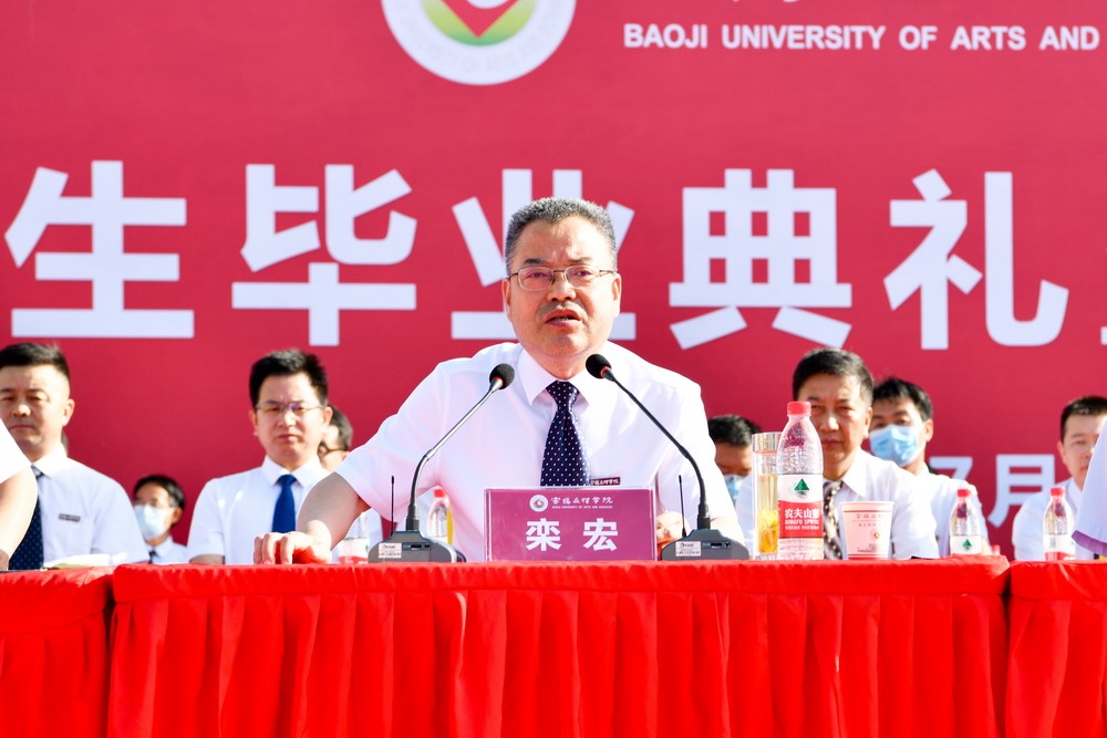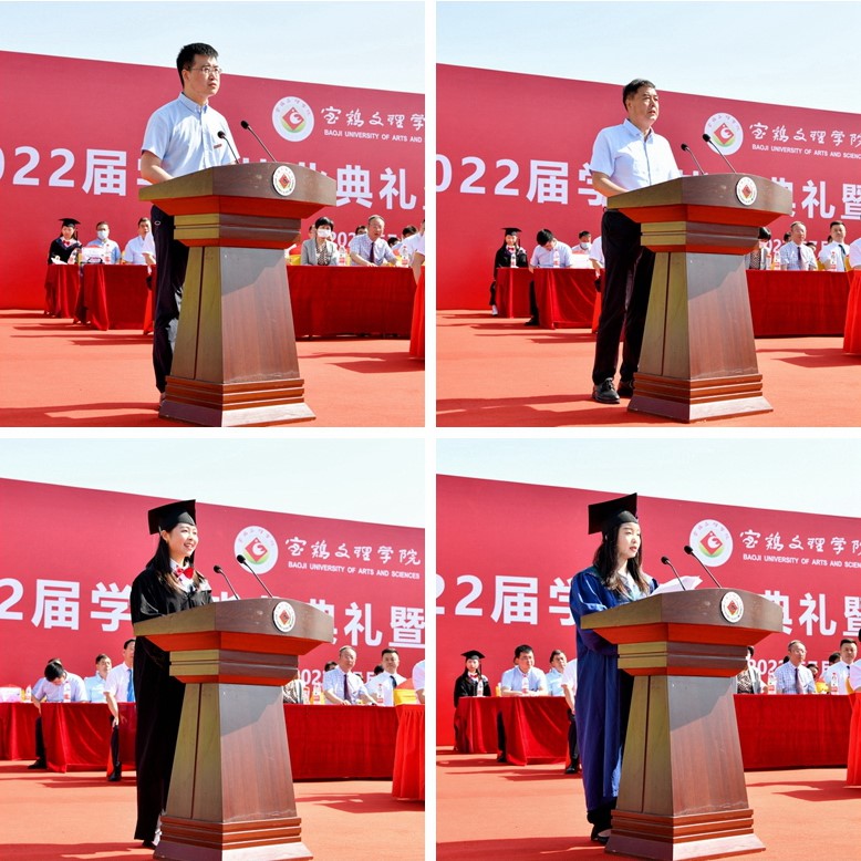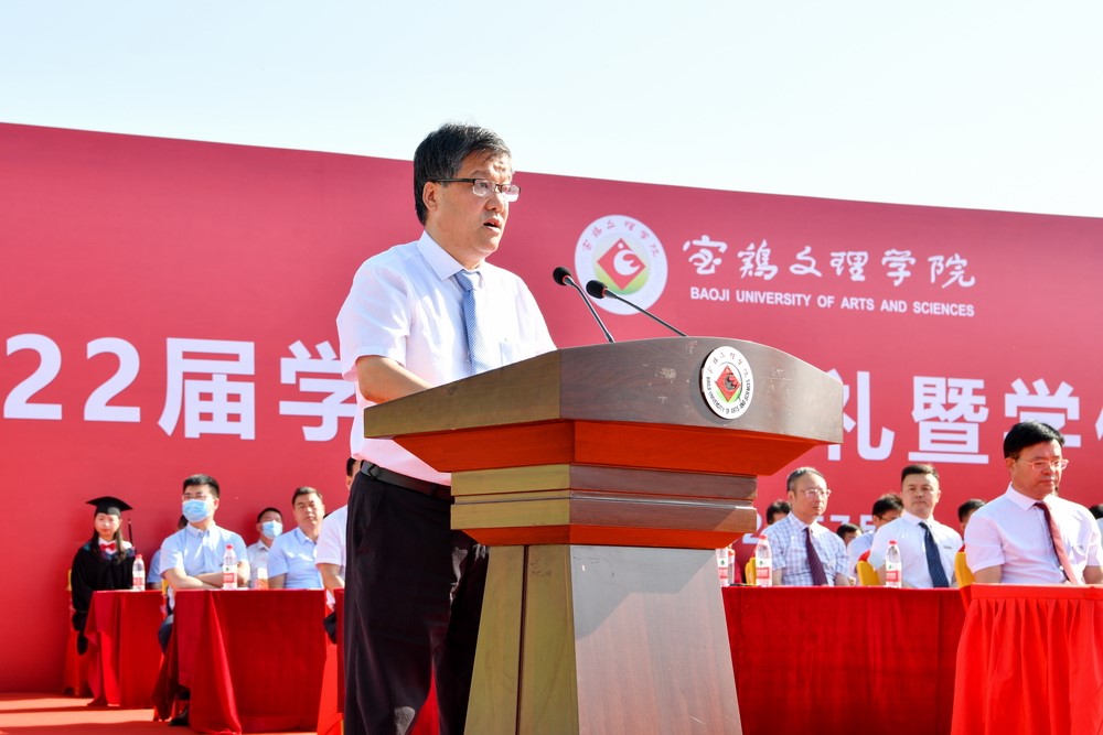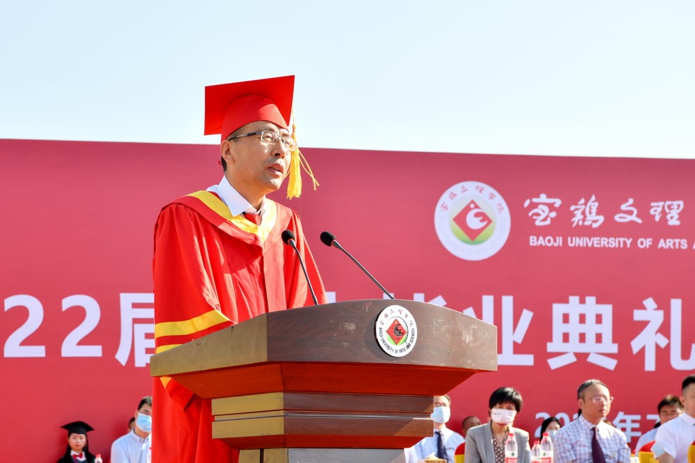 郭霄鹏指出,过去的几年里,2022届毕业生风雨兼程、不断突破,刻苦学习、全面发展,勇于创新、追求卓越,关爱同学、尊敬师长,无私奉献、热心公益,心系国家、感恩社会,以校为荣、爱校如家,是与新时代同向同行、共同前进的优秀青年,是有伟大创造力的青年,以奉献之姿书写青春之美,让前行的宝文理永葆勃勃生机,为奋进的宝文理增添了一道又一道夺目的光彩。他代表学校对同学们为学校发展作出的重要贡献表示衷心感谢。他向同学们提出三点希望:一要心系祖国,志存高远。希望同学们牢记习近平总书记“只有把小我融入大我,才会有海一样的胸怀,山一样的崇高”的教诲,与祖国共命运、与时代同步伐、与社会共进步,以青春之我、奋斗之我,践行“请党放心、强国有我”的青春誓言,将宝文理精神和“博文明理、厚德尚能”的校训内化于心、外化于行,为自己代言,为青春代言,为母校代言,到新时代的广阔天地中施展抱负、建功立业,争做“胸有大志、心有大我、肩有大任、行有大德”的新青年,让青春之花绽放在祖国最需要的地方。二要坚韧不拔,砥砺奋进。希望同学们不要被人生的无常和岁月的沧桑消磨掉奋斗的底色,在面对前进道路上的崎岖坎坷时,坚信“办法总比困难多”,始终保持昂扬向上的精神状态和一往无前的奋斗姿态,铸就坚韧不拔、不屈不挠的品格,在乘风破浪中开拓前进,在披荆斩棘中开辟天地,在攻坚克难中创造业绩,把生活施加的苛责改写成无愧于时代的人生华章。三要勤学苦练,增长才干。希望同学们牢记习近平总书记“梦想从学习开始、事业靠本领成就”的嘱托,时刻保持学习的热情,把学习作为穷其终生的首要任务,作为一种责任、一种精神追求、一种生活方式,夯实自己的知识基础,在不断学习中增长才干、丰富自我、提升素质,让勤奋学习成为不断进取的动力,让增长本领成为铸就梦想的基础。最后,郭霄鹏祝愿广大毕业生以梦为马,仗剑天涯,凌云壮志,再创辉煌。