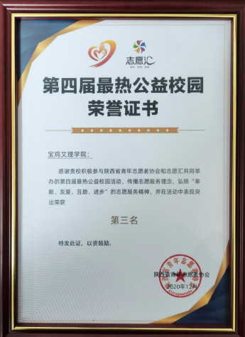 近日获悉,在陕西省青年志愿者协会和志愿汇共同举办的第四届最热公益校园活动中,beat365官网喜获第三名。