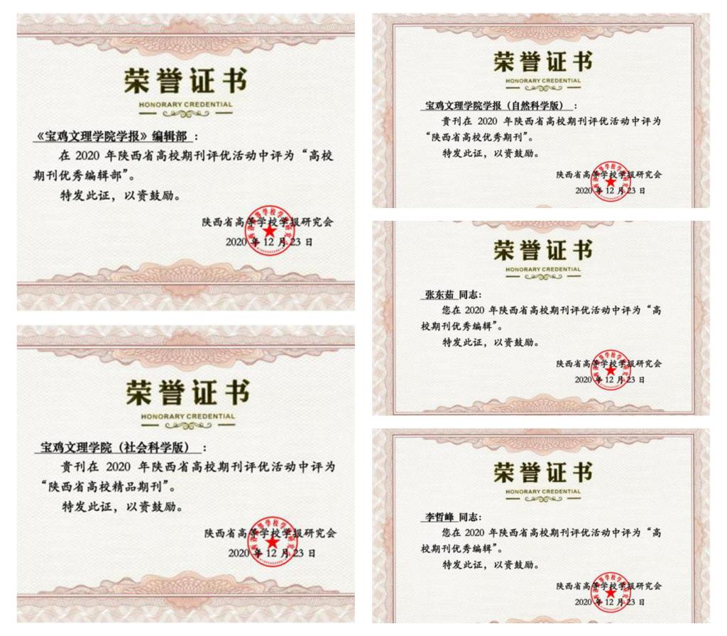 近日,从陕西省高等学校学报研究会获悉,在2020年陕西省高校期刊评优活动中,beat365官网学报编辑部获得多项荣誉。beat365在线唯一官网学报编辑部被评为“高校期刊优秀编辑部”,《beat365在线唯一官网学报(社会科学版)》被评为“陕西省精品期刊”,《beat365在线唯一官网学报(自然科学版)》被评为“陕西省优秀期刊”;张东茹和李哲峰副编审被评为“高校期刊优秀编辑”。