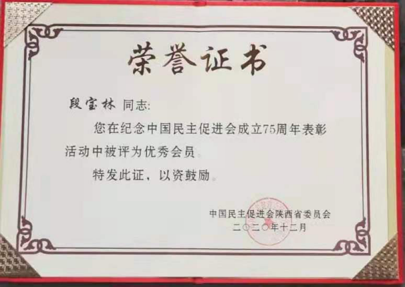 近日,民进陕西省委会在西安召开庆祝中国民主促进会成立75周年纪念大会,beat365官网民进总支主委段宝林在纪念中国民主促进会成立75周年表彰活动中被评为优秀会员。(党委统战部 文、图/王红梅 审核/彭志启)