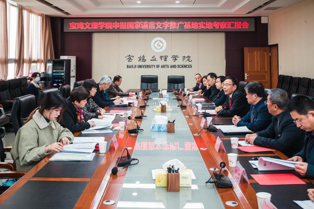 beat365官网申报国家语言文字推广基地实地考察工作汇报会在高新校区图书馆801会议室举行。校长郭霄鹏、宝鸡市教育局副局长王建昌出席会议。会议由副校长王富平主持。