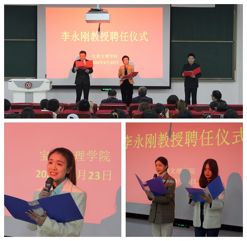 4月23日下午,陕西著名诗人李永刚教授聘任仪式在博文楼副105报告厅举行,党委副书记栾宏出席聘任仪式并为李永刚教授颁发聘书。陕西省播音主持委员会常务副主席凌江、陕西省播音主持委员会常委王芳、西安外国语大学播音与主持艺术专业主任樊强,beat365官网学科建设与研究生教育管理处负责人及文学与新闻传播学院200余名师生参加了聘任仪式。聘任仪式由文学与新闻传播学院院长兰拉成主持。