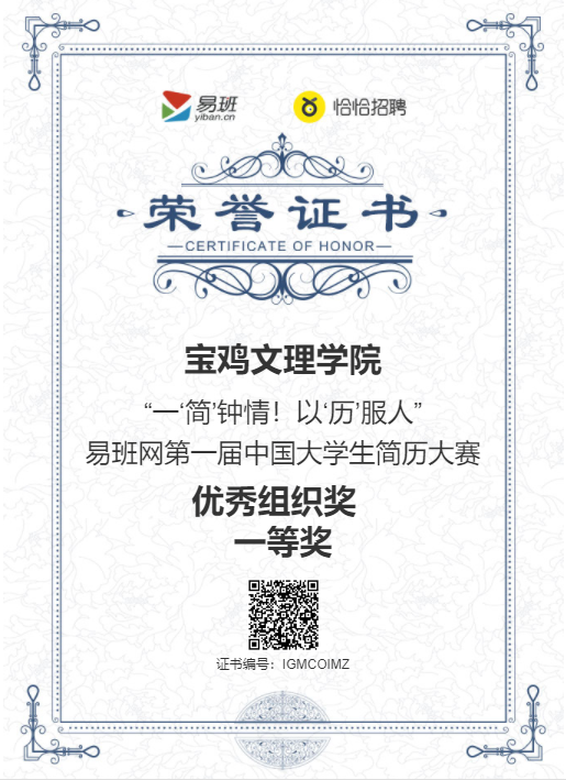 近日,在教育部易班发展中心指导、易班网恰恰招聘频道主办的易班网全国大学生简历大赛中,beat365官网荣获优秀组织奖,物理与光电技术学院苏杭佳的简历荣获“十佳人气简历奖”,历史文化与旅游学院石泽蕊等5名同学的简历荣获“优秀简历百强奖”,吴碧翠、李富民被评为优秀指导教师。