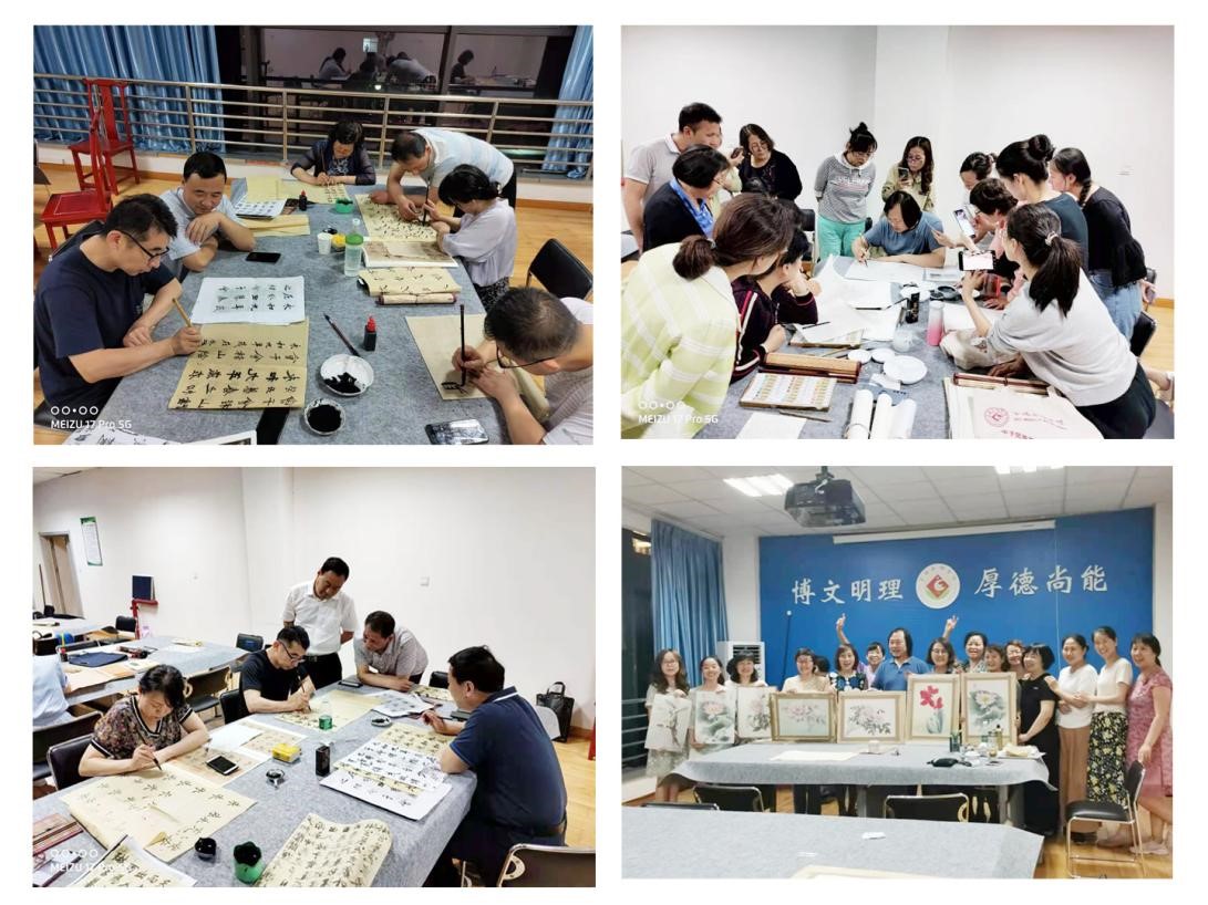 培训过程中,两位老师凭借多年的教学经验为各位学员亲自示范,细心指导,从我国书画文化的发展历史,传统书画工具材料的历史演变,到每一笔的用笔方法和轻重缓急都耐心讲授。风趣诙谐的语言和人人参与的教学方式,使教职工放松身心、缓解压力,陶冶情操。提升了教职工艺术素养,满足了广大教职工的精神文化需求。