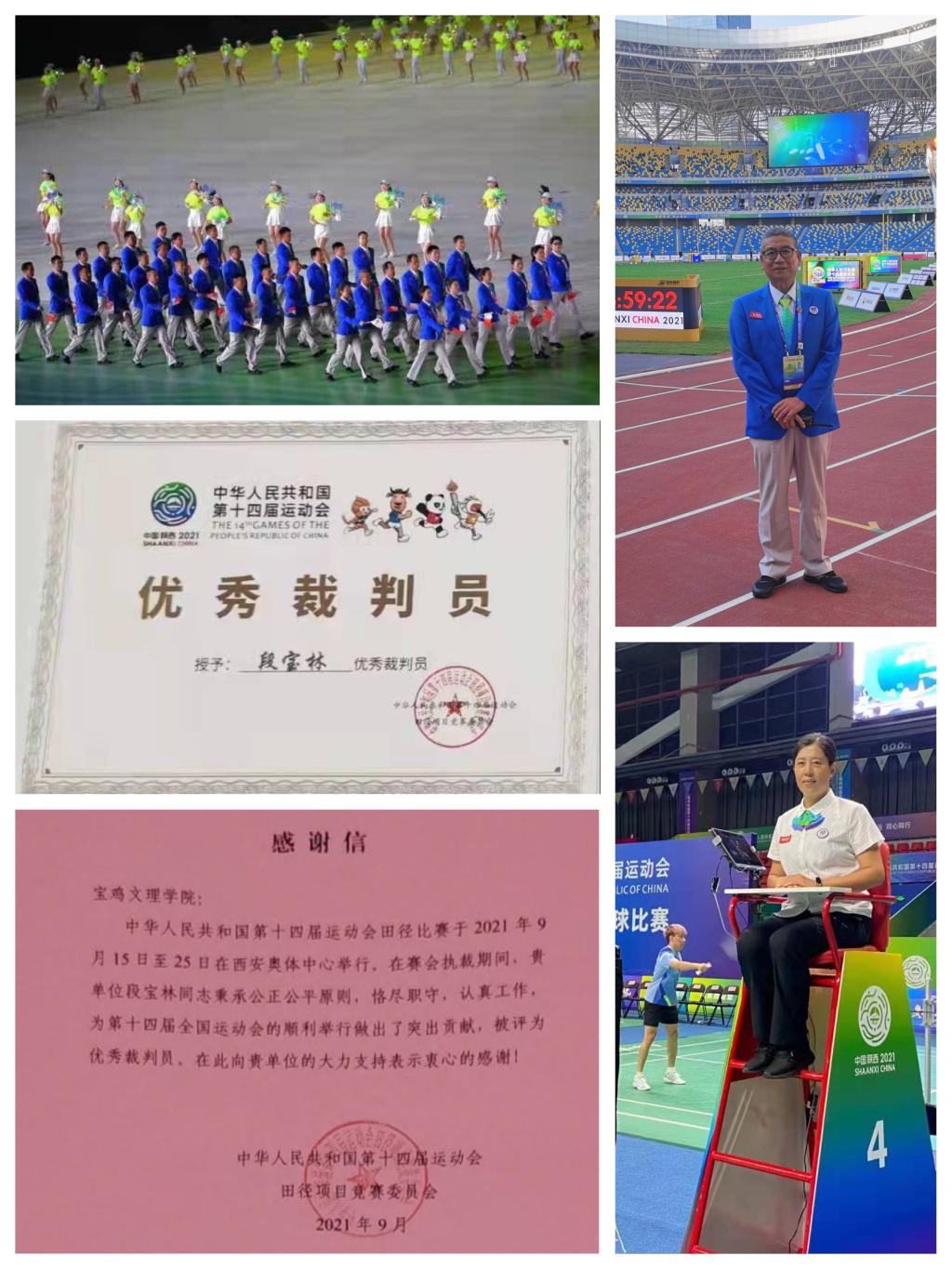 段宝林教授作为裁判员代表参加了运动会开幕式,并担任田径比赛的裁判工作,被授予第十四届全国运动会“优秀裁判员”称号。任慧琴副教授担任群众赛事活动羽毛球比赛的裁判工作。