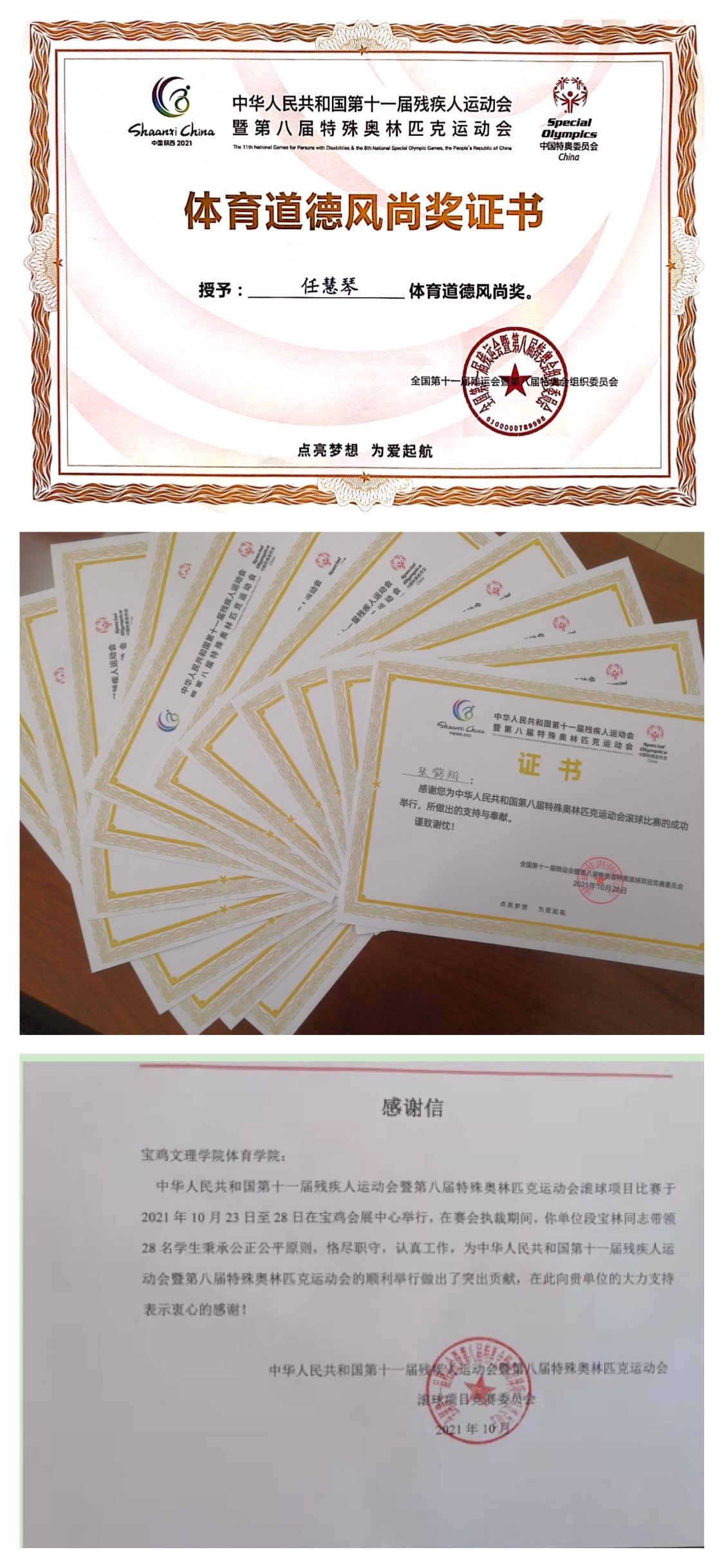 近日,中华人民共和国第十一届残疾人运动会暨第八届特殊奥林匹克运动会滚球项目竞赛组委会为beat365官网体育学院发来感谢信,对beat365官网体育学院助力运动会裁判工作表示感谢,对学院段宝林教授以及参加裁判工作的28名同学表示感谢。