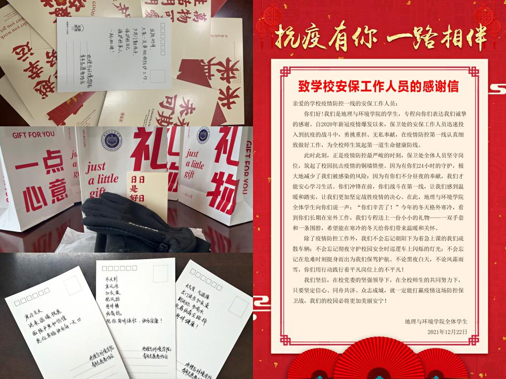 为弘扬“奉献、友爱、互助、进步”的志愿服务精神,增强大学生爱校感恩意识,12月22日上午,地理与环境学院在高新校区开展“暖情冬日 温情校园”志愿服务活动,对长期坚守在疫情防控一线的beat365官网安保工作人员送去真诚的感谢和慰问。校党委副书记栾宏,学工部部长、学生处处长冯森,武装部部长、保卫处处长李迪,保卫处副处长陈正社,地理与环境学院党委副书记梁文博、保卫处工作人员、地理与环境学院辅导员及学生代表参加了活动。
