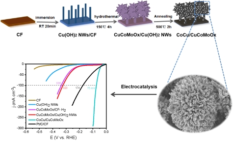 高活性、高稳定性的非贵金属基电催化剂是实现低成本、大规模析氢反应和电解水的关键。在这项工作中,具有高导电性的泡沫铜基底被用于构建花状CuCoMoOx多孔纳米片,CoCu纳米合金颗粒可被精确调控用于修饰CuCoMoOx多孔纳米片,从而获得更大的表面积和富含缺陷的催化表面。CuCoMoOx多孔纳米片与引入的CoCu纳米合金颗粒之间的协同效应可以提高其催化性能。该催化剂在碱性介质中表现出最佳的电催化活性:100 mA/cm2的电流密度下过电位为75 mV,并且在25 h内具有长期稳定性。此项工作对于扩展高效的产氢产氧双功能电催化剂,发展亲水疏气、金属性、自支撑、双功能的电催化剂具有重要指导意义。(研究生院、物理与光电技术学院 文/赵亚儒 图/辛旺 审核/凡明锦、钱郁)