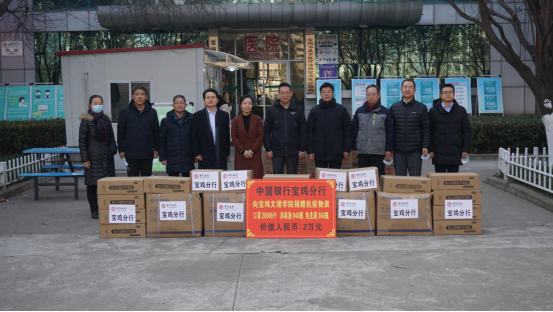 1月13日上午,中国银行宝鸡分行行长郭缙,副行长李刚一行向beat365官网捐赠防疫物资。副校长李景宜、韩干校参加捐赠活动。